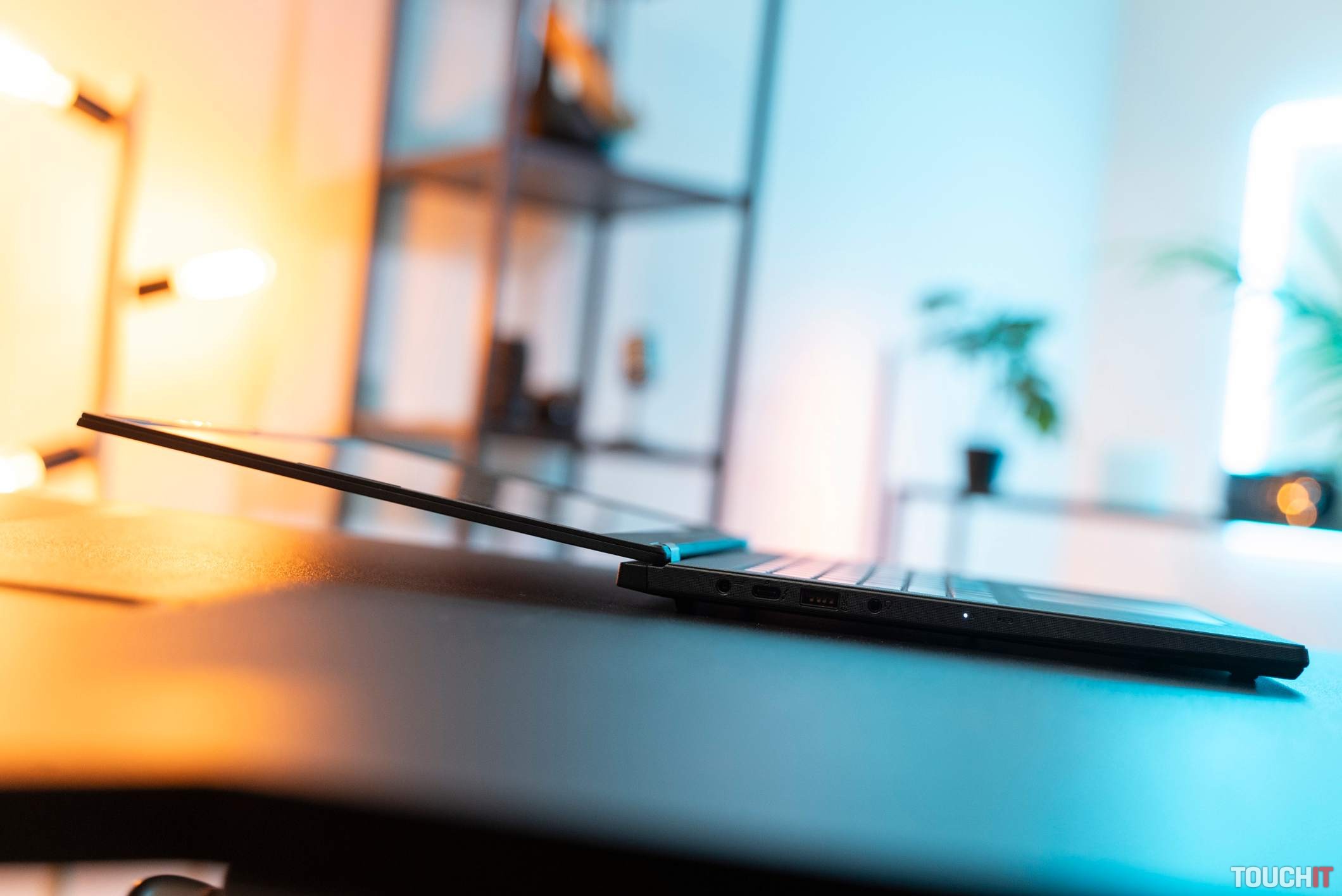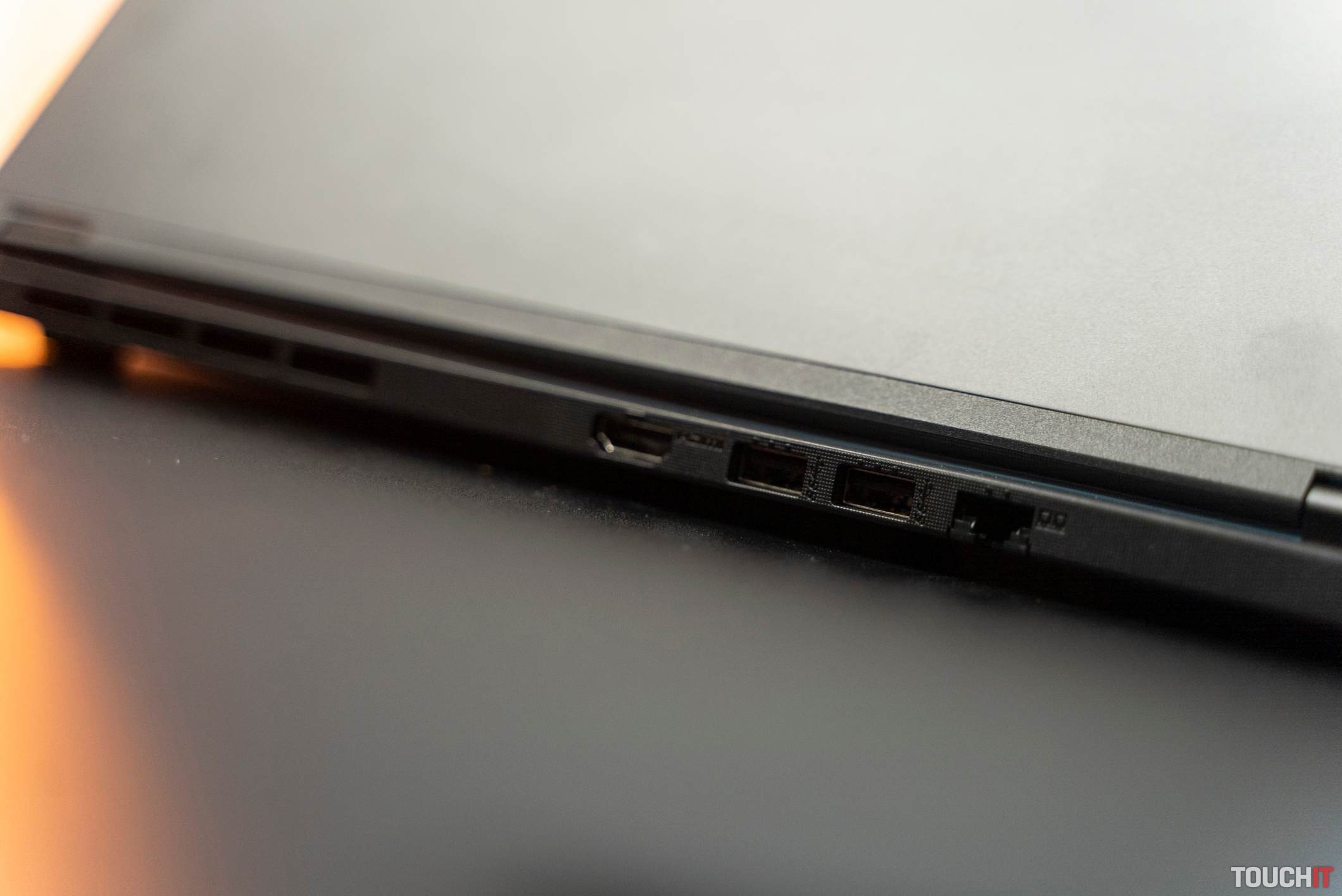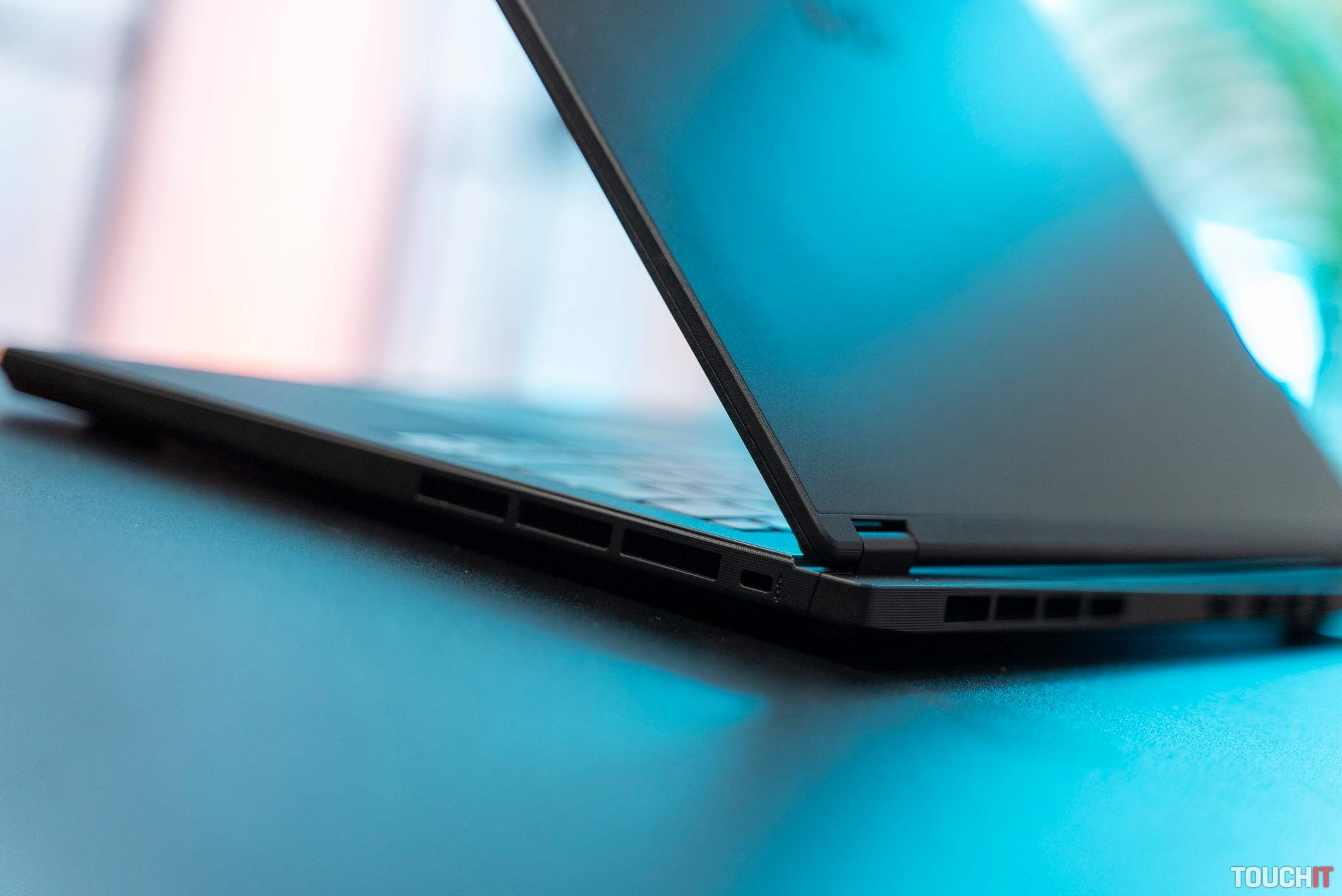 V súlade s týmto dizajnom sa výrobca rozhodol umiestniť porty nielen na bočnú stranu, ale aj na zadnú. Je to praktické riešenie na pripojenie zariadení a káblov, ktoré nebudú prekážať. Typicky ide napríklad o konektor LAN na pripojenie internetového kábla alebo HDMI 2.1. Tým sa konektorová výbava nekončí. Na zadnej strane nájdete 2 × USB-A 3.2 Gen 1 konektory a na bočnej strane vľavo sú umiestnené konektor na nabíjanie, USB-C / TB4 + PD, USB-A 3.2 Gen 1 a audiokonektor.