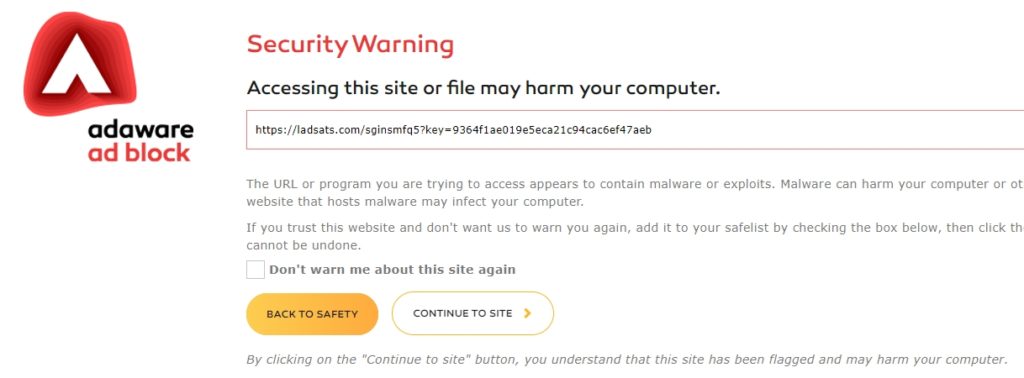 Riziková stránka, na ktorú upozorňuje bezpečnostný doplnok AdAware v prehliadači