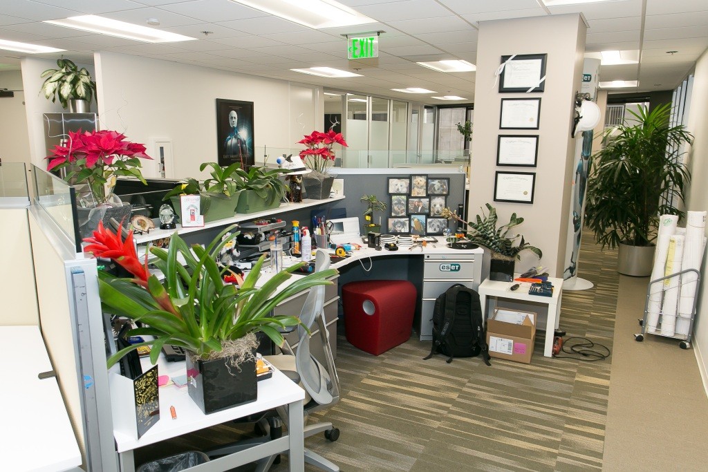 Toto bolo pracovné miesto zamestnanca, ktorý miluje kvety. Do práce si môžete zobrať aj psa alebo mačkuAk máte chuť a čas, môžete zájsť aj do telocvične na treťom poschodí