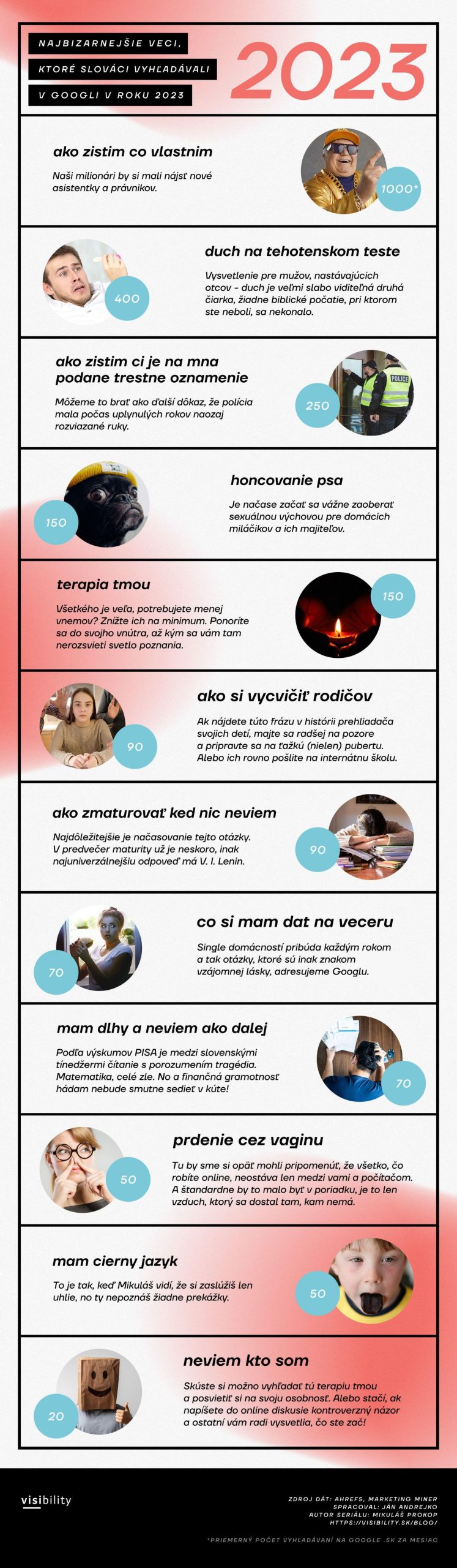 SEO špecialisti Visibility sa aj tento rok popri analýzach kľúčových slov stretli so zaujímavými výrazmi a nezabudli sa o ne podeliť s verejnosťou. Pripravili si tak infografiku, na ktorej znázorňujú najviac bizarné výrazy vyhľadávané Slovákmi. Pri daných výrazoch navyše viete nájsť aj číslo, ktoré informuje o priemernom počte mesačného vyhľadávania za posledných 12 mesiacov. Prispeli ste do týchto štatistík aj vy? Môžete sa na to pozrieť nižšie.