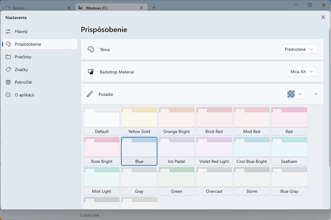 Files majú v sebe podporu cloudových služieb, ktoré sa budú zobrazovať v ľavej lište podobne ako obľúbené adresáre alebo diskové jednotky. Nechýba ani podpora kariet. Na výber je viacero režimov zobrazenia adresára, dokonca si môžete prispôsobiť farebnú tému. Režim Mica alebo Acrylic vám prepnú vizuálne zobrazenie okna programu a to na plné alebo polopriehľadné, podobne ako to má napríklad ponuka Štart.