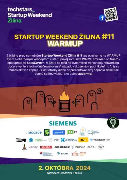 Dva týždne pred samotným Startup Weekendom v Žiline – už 2/Októbra 2024, máte jedinečnú príležitosť zúčastniť sa špeciálneho zahrievacieho WARMUP eventu „Fresh or Trash“ v spolupráci so SaasGarden a Startup Weekend Žilina, ktorý sa uskutoční v PostCafe, NORDCITY Poštová 1. Tento formát, obľúbený v startupovej komunite po celom svete, umožňuje začínajúcim podnikateľom a tímom rýchlo a efektívne získať spätnú väzbu na svoje nápady.