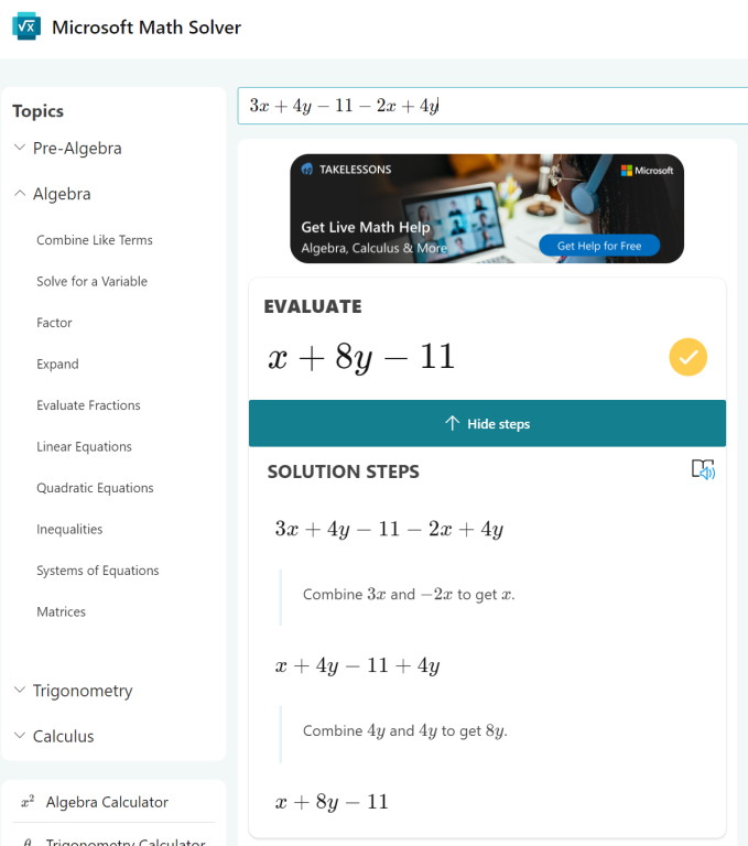 Absolútnou špičkou je Microsoft Math Solver. Vypočíta rovnice a matematické úlohy z algebry alebo napríklad trigonometrie. Stačí vpísať úlohu do okna na riešenie a nechať počítať za vás. Hlavnou výhodou je, že okrem výsledku vám napíše presný postup ako počítať s jednotlivými krokmi.