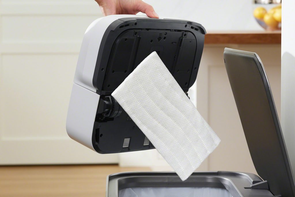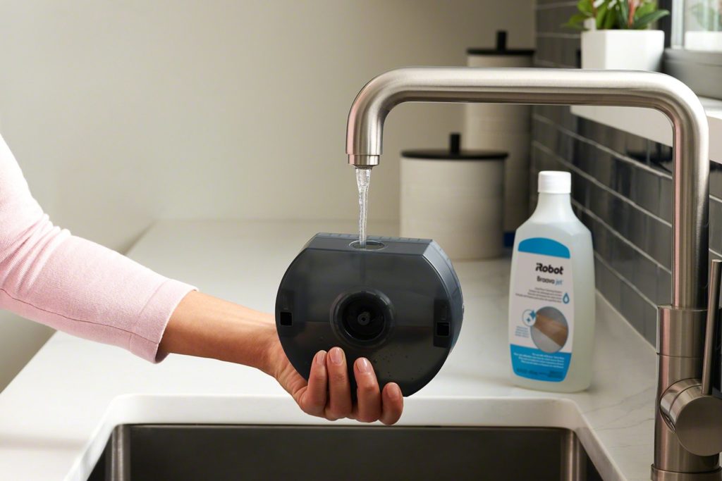 Robotický mop vyžaduje pripojenie čistiacej podložky, ktoré sú jednorazové a umývateľné a sú určené na suché alebo mokré čistenie. V prípade mokrého čistenia je tiež potrebné naplniť nádržku a prípadne pridať čistiaci prostriedok na pevné podlahy. iRobot má svoj vlastný čistiaci prostriedok, ktorý je navrhnutý na použitie s jeho mopom. 473 ml fľaštička stojí 14,99 eura, vzorku na dve použitia nájdete aj priamo v balení.