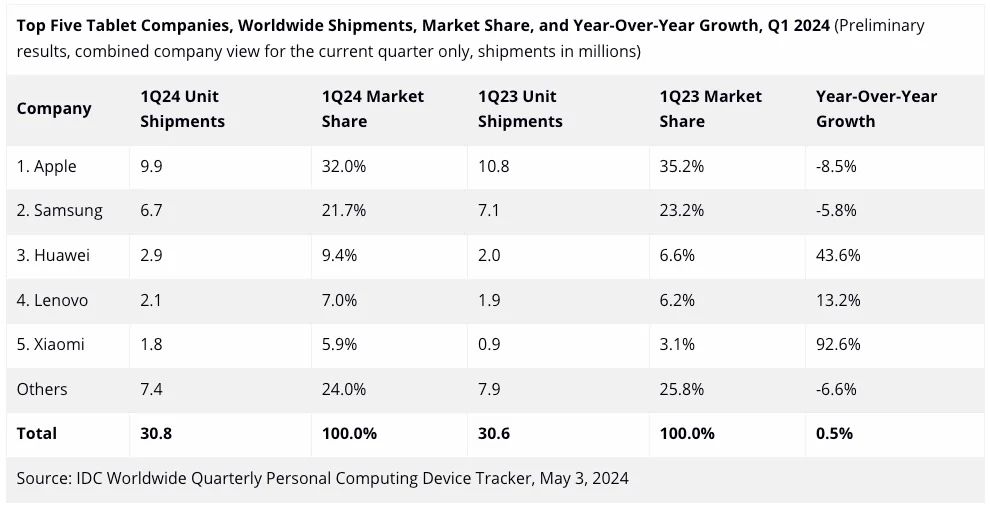 Spoločnosť Huawei v poslednom roku zaznamenala výrazný nárast predajov zariadení najmä v domácej Číne. Postupne sa však snaží opäť presadiť aj na iných trhoch, čo sa jej darí najmä v oblasti smartfónov. Lenovo je tiež veľkým hráčom na trhu s tabletmi a najväčší nárast predajov, až o 92,6 %, zaznamenalo čínske Xiaomi. To každoročne predstavuje skvelé tablety vo viacerých cenových kategóriách. Najnovší model Xiaomi Pad 6S Pro 12,4 cieli na fanúšikov veľkých displejov a mohol by prispieť do budúcoročného porovnania výrobcov tabletov.