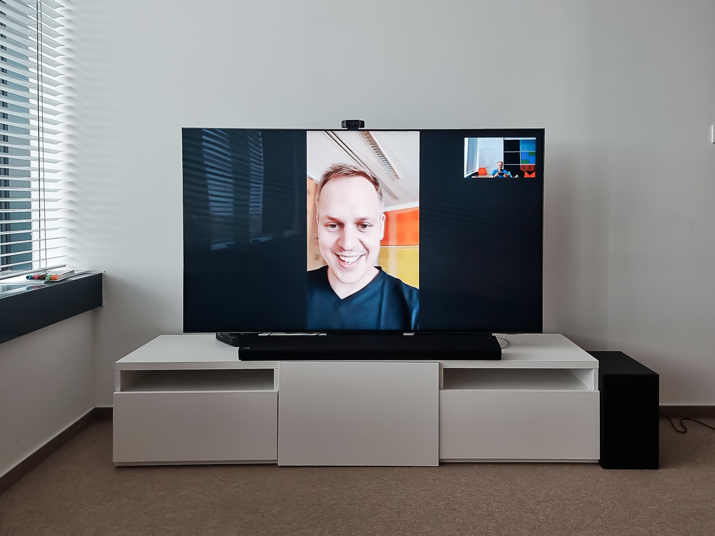 Ďalšou možnosťou je realizácia on-line mítingov priamo cez televízor. Prirojili sme k nemu kameru od firmy Logitech, ako aplikáciu sme spustili Google Duo a pohodlne komunikovali s inou osobou. Je to trochu zvláštne, ale na veľkej obrazovke to vyzerá celkom dobre.