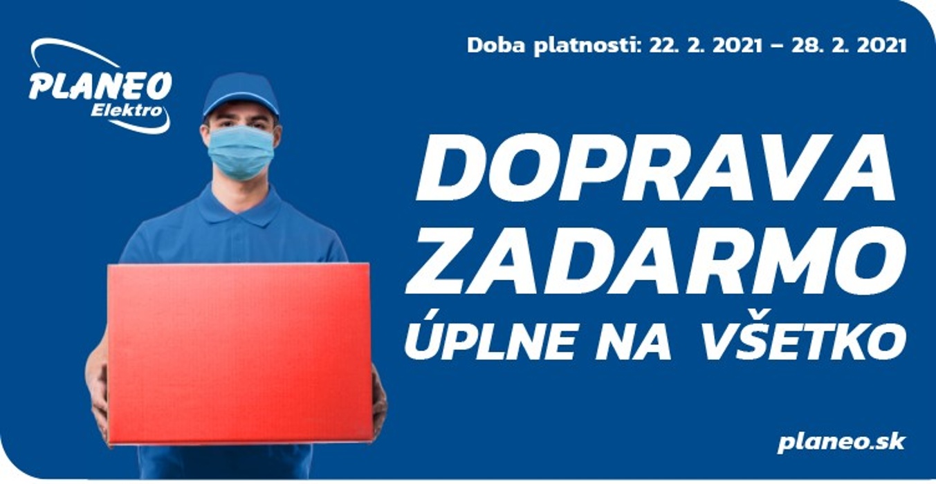 Čokoľvek si od 22.2. do 28.2.2021 na www.planeo.sk zakúpite, kuriér vám to privezie domov po prvé dvere bez príplatku za dopravu. Využite zároveň množstvo zliav na práčky, chladničky, notebooky, počítače, záhradnú techniku, hodinky a ďalší tovar z kategórie elektrospotrebičov či potrieb do domácnosti a v PLANEO Elektro opäť nakúpite výhodnejšie!