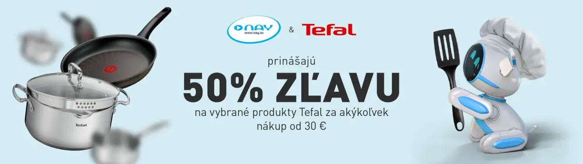 Či už ale nakupujete smartfóny, počítače, elektroniku do domácnosti alebo čokoľvek zo sortimentu predajcu NAY, pri nákupe nad 30 eur získate príjemný bonus. Nezáleží, či nakupujete v kamennej predajni alebo na e-shope nay.sk. Pri každom nákupe nad 30 eur totiž získate kupón na zľavu 50 % na vybrané produkty značky Tefal.