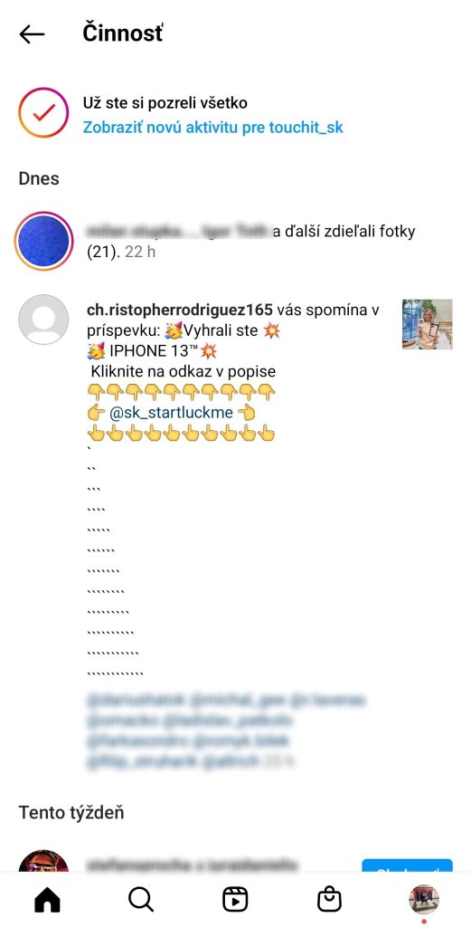 Určite tušíte, že to asi tak nebude a teda, je správne byť na pozore. My sme si vyskúšali, ako k podvodu vlastne príde. Najčastejšia forma notifikácie je taká, že vás niekto neznámy označí v príspevku ako víťaza. Keď kliknete na profil toho, čo vás označil, uvidíte množstvo fotiek s iPhone 13 a usmiatymi tvárami.