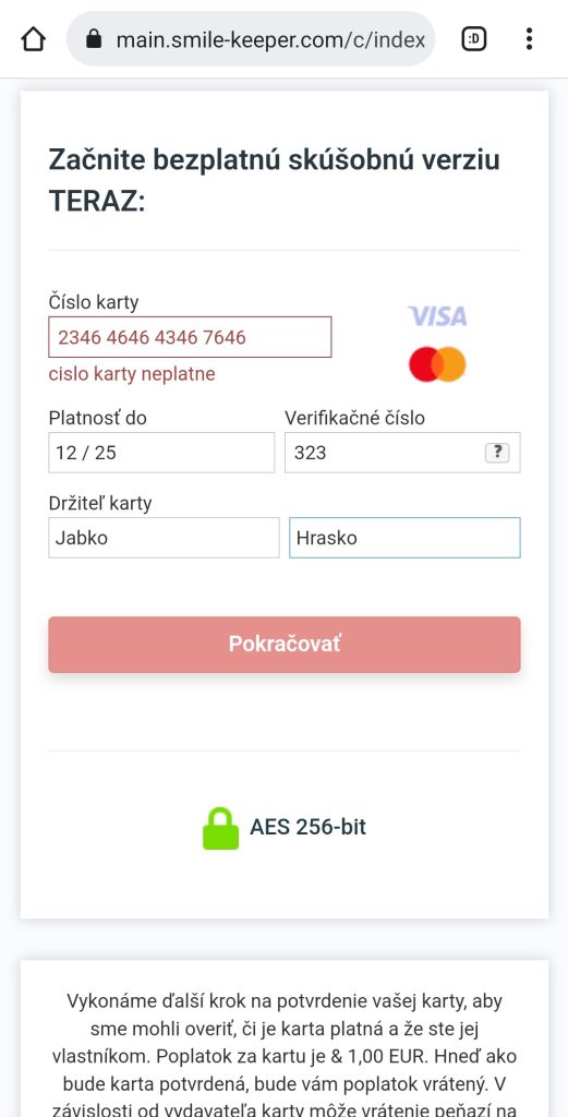 A tu to už volajú bezplatná skúšobná verzia 🙂 Ešte nižšie sa dočítate, že sa takto prihlasujete k tomu, že každý mesiac budete za akési členstvo platiť 28,95 Eur. A tu sa už údaje overujú. Aké priehľadné. V tejto je jasné, že ide o podvod a vyplnenie čísla karty by znamenalo podpísanie bianko šeku.