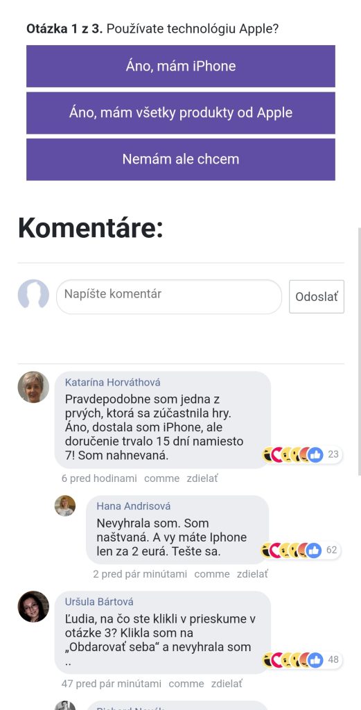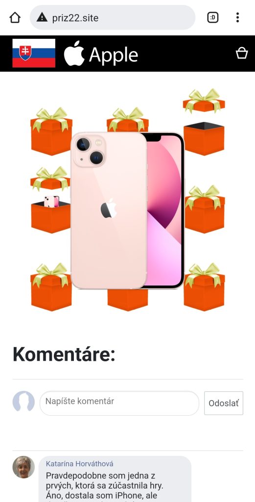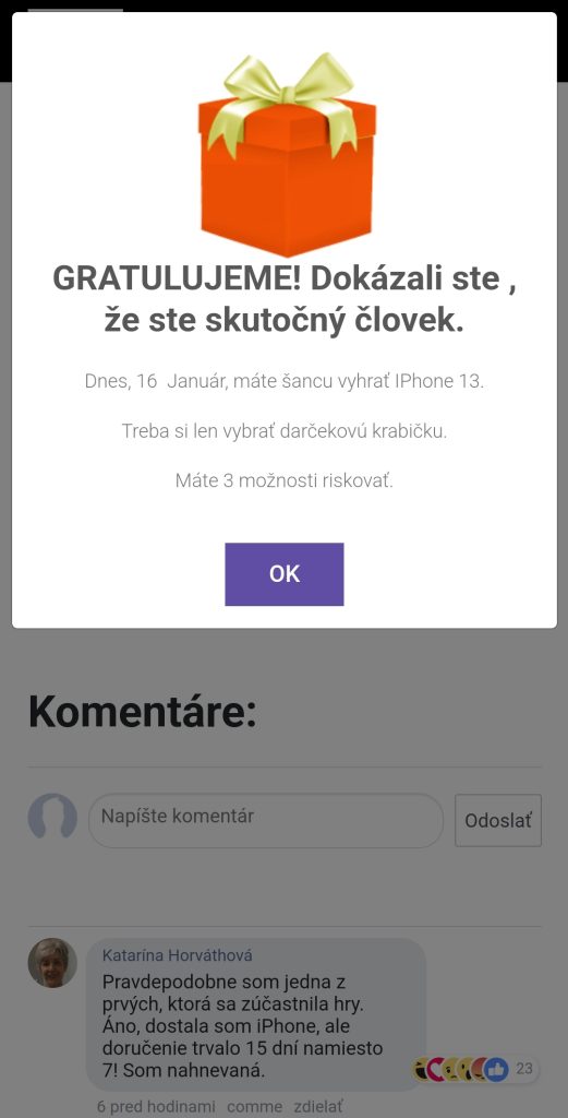 No a pokračuje to ďalej „súťažnými“ otázkami, na ktoré pozná odpovede asi každý – prečo ste si vybrali iPhone namiesto iných telefónov a Čo urobíte s vyhraným telefónom. Nasleduje proces, ktorý údajne preveruje vaše odpovede a v prípade akýchkoľvek odpovedí sa dostanete k hláseniu, že ste skutočný človek a opäť vám gratulujú. Máte si ale vybrať jednu darčekovú krabičku z 9 možných. Prvý pokus býva obyčajne neúspešný, ale nevadí, ešte máte dva pokusy. A áno, verte nám že teraz už úspešní budete 🙂