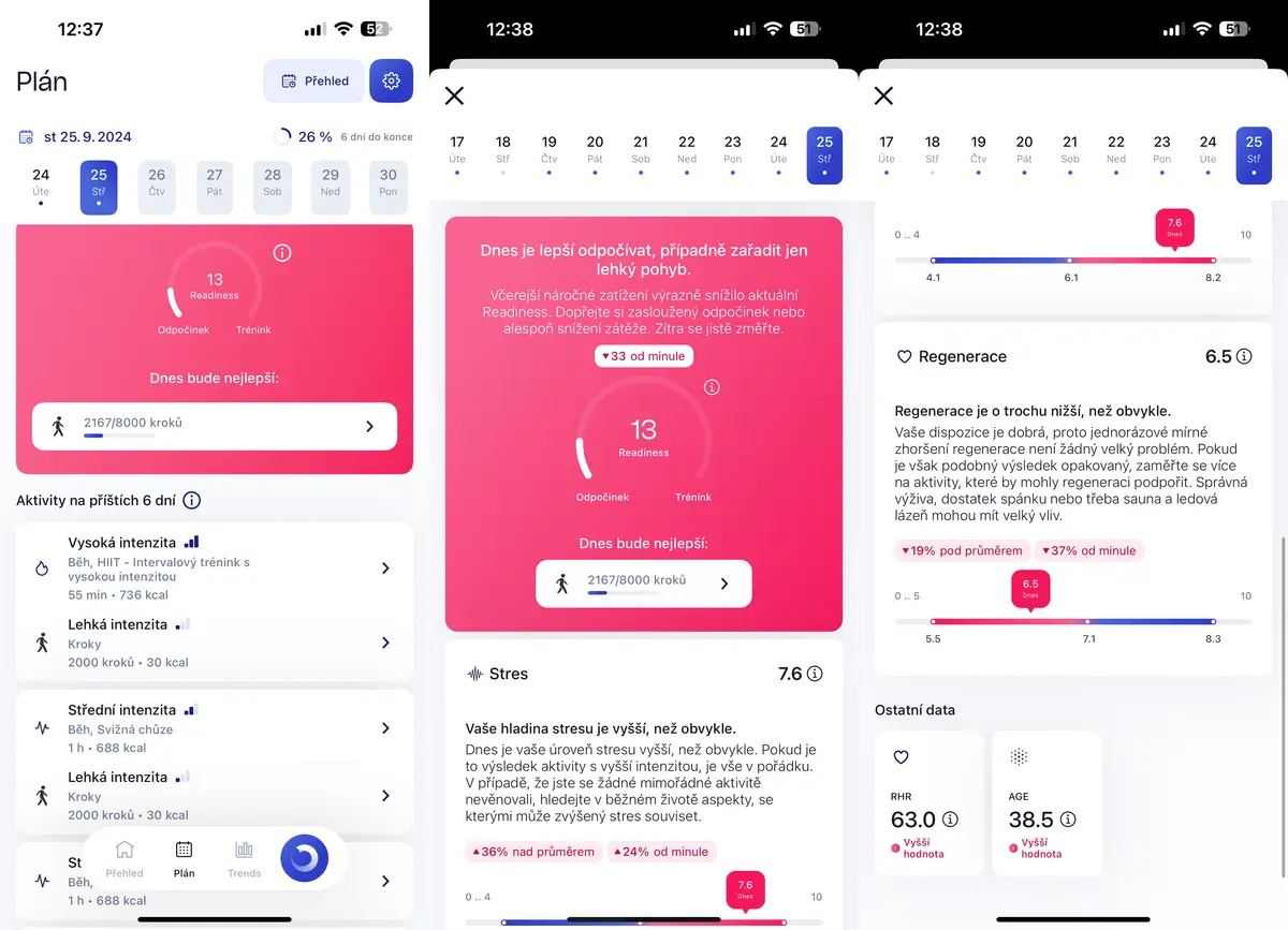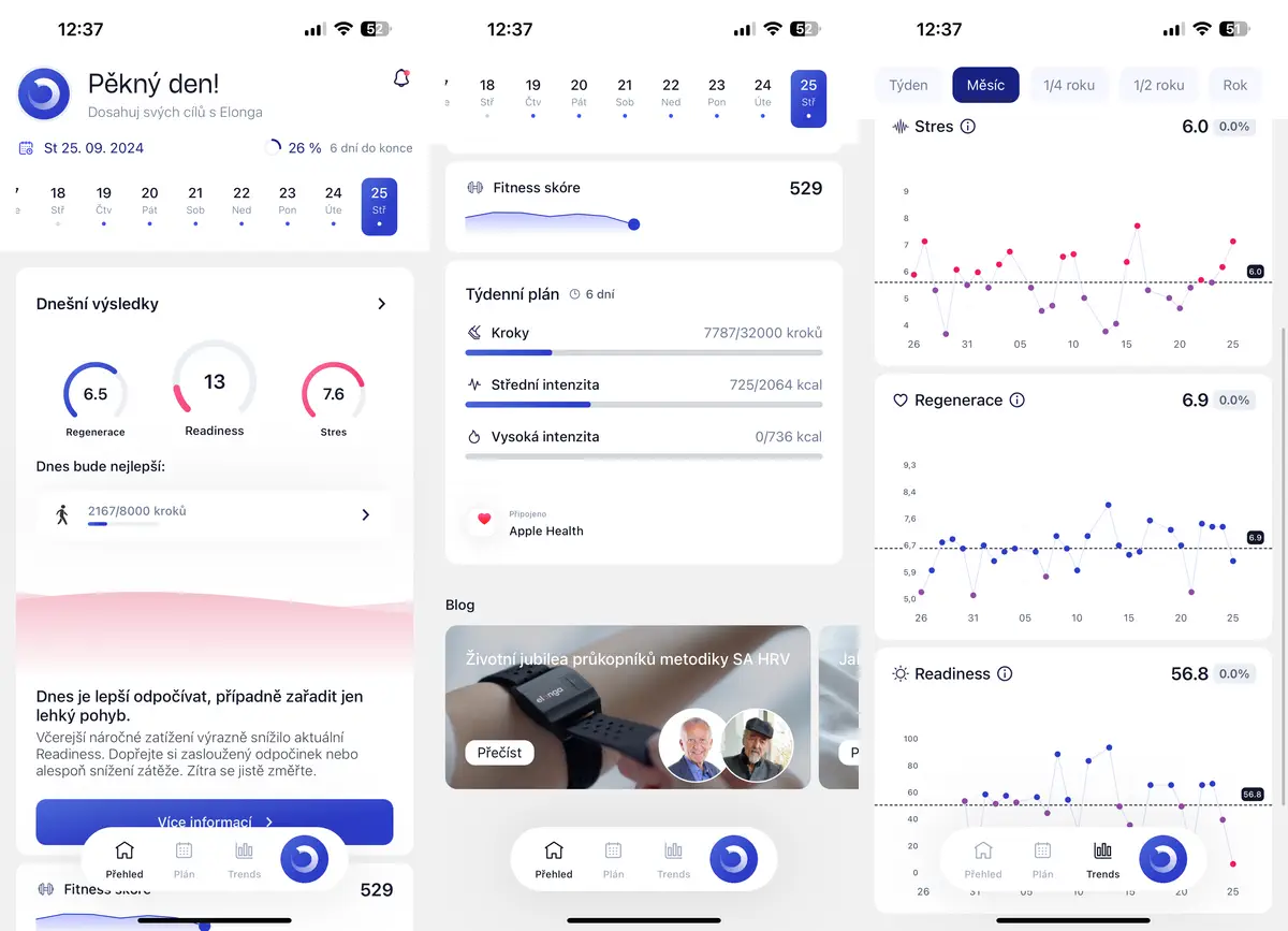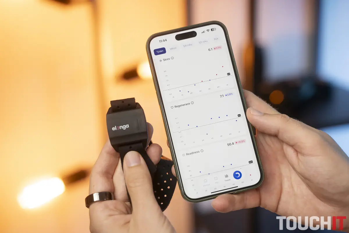 Elonga prezentuje namerané dáta vo forme troch výsledkov – Stres (sympatický nervový systém), Regenerácia (parasympatický nervový systém) a Readiness. Okrem číselného stavu zobrazuje aj zmenu v porovnaní s predchádzajúcim meraním a vašou priemernou hodnotou. Ide o užitočné dáta. Súčasťou hodnotenia je krátky textový sumár v češtine.