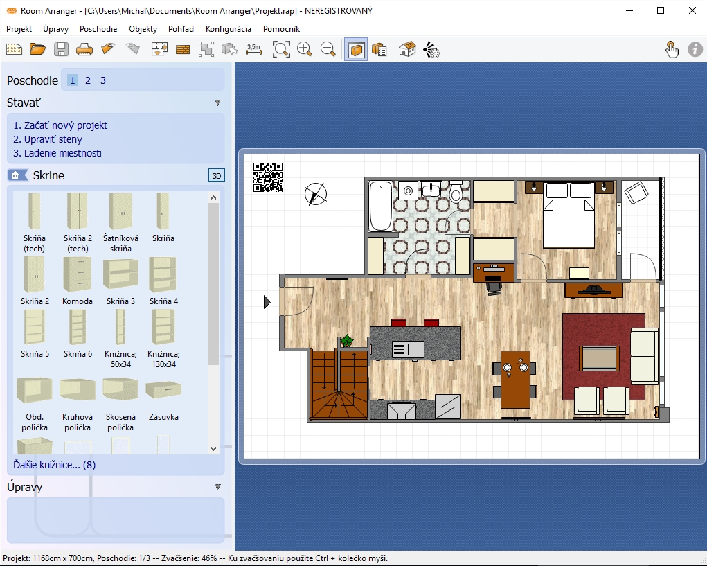 Tento program má veľmi dobrú výbavu, zároveň je však nadmieru jednoduchý na použitie. Pri návrhu oceníte najmä to, že pod 2D pohľadom je aj 3D režim. Hneď ako pridáte nový kus nábytku do 2D, vytvorí sa naň trojrozmerný pohľad. Postupne, ako pridávate objekty do miestnosti, 3D náhľad sa posúva a zmenšuje. Vždy uvidíte celú vašu miestnosť. Toto je vynikajúca vec. Objektov je dostatok a rozhodne sú tu všetky základné. Nebudete mať problém navrhnúť obývačku, kuchyňu alebo napríklad spálňu. Viacposchodové domy budete môcť prepojiť tromi typmi schodov. Pri každom type objektu sa dá upraviť jeho rozmer. Pri návrhu môžete v zozname objektov zrušiť označenie tých, ktoré nechcete na návrhu vidieť. V prípade, že sa neviete rozhodnúť pre vybraný typ objektu, dajte ich do návrhu viac na jedno miesto a ostatné zatiaľ nebudú viditeľné. Samozrejme, aj tu môžete pridávať okná a dvere, upravovať pôdorys podľa potreby a nemusíte sa limitovať len na štvorec alebo pravouhlé steny. Chýbajúce objekty sa dajú importovať, na internete je dostatok nových objektov. Importovať môžete aj textúry. Objektom sa dajú meniť vlastnosti. V zásade teda eliminujete absenciu väčšinu z nich. Vaňu aj sprchovací kút už máte. Ak treba, zmeníte im rozmery a uložíte si ich do budúcna pod novým objektom. Meniť môžete aj farbu a textúru. Plán je vhodný na zakreslenie presných údajov a v prípade potreby môžete ponechať viditeľné anotácie objektov. Na ukazovanie miestnosti môžete využiť video export z realistického 3D zobrazenia. Návrhy sa dajú exportovať do viacerých formátov, ako napríklad PDF, PNG alebo SVG.