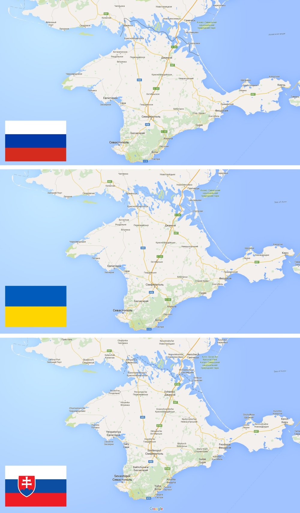 Rozdiely na mapách Googlu. Kým Rusi vidia, že Krym patrí im, Ukrajinci vidia jeho príslušnosť k sebe. Slovákom sa zobrazuje územie ako oblasť s nevyriešeným hraničným sporom