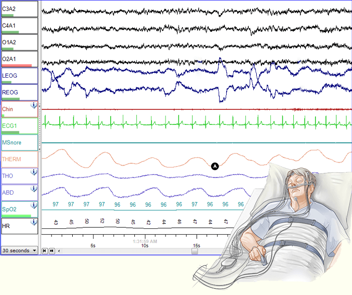 Výstup dát z jednotlivých senzorov, ktoré tvoria polysomnogram na odborné a spoľahlivé zhodnotenie kvality a porúch spánku /Ilustrácia: National Heart Lung and Blood Institute/