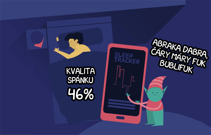 Na oko vyzerá všetko v poriadku. Nové smarthodinky si nasadíte na ruku, nastavíte aplikáciu a hurá do perín. Ráno sa už hrnú dáta o tom, ako dlho ste spali, koľkými cyklami tvrdého a mäkkého spánku ste prešli, aký bol pri tom váš srdečný tep a či bol váš spánok odpočinkový na 90 %, 80 % alebo nebodaj len na 65 %. Všetko pravdaže vidíte nanesené na grafe, pekne farebne rozlíšené, všetko je jasné, zanalyzované a prepočítané. Ak mi hodinky ukazujú, že som spal dobre len na 74 %, tak to predsa musí byť pravda. Musím teda hneď začať spať lepšie, lebo zle dopadnem. Ešte že som si kúpil toto úžasné monitorovacie zariadenie, ktoré ma na všetky moje spánkové nedostatky, zlé cykly, prerušenia a percentá oddychu upozorní. Ak sa budem snažiť a budem svedomitý, zajtra už určite dosiahnem aspoň na 95 %!