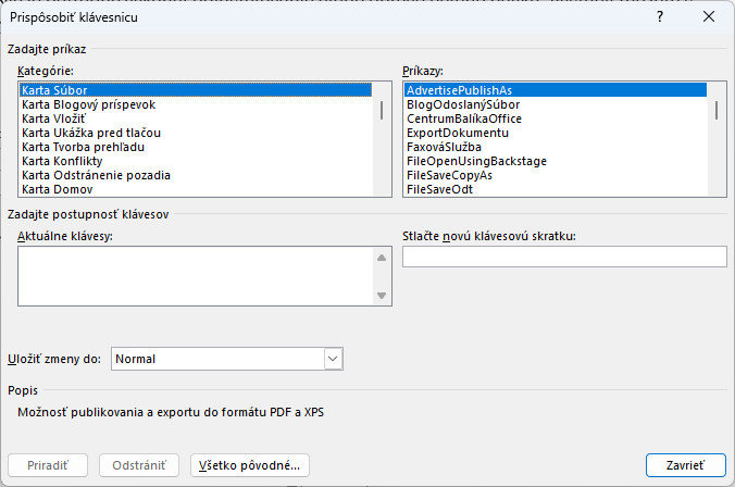 Hneď pod tým sa nachádza sekcia na stlačenie klávesovej skratky. do editačného poľa umiestnite kurzor a stlačte klávesovú skratku ako keby ste konkrétnu funkciu chceli použiť. Do ľavej časti s názvom aktuálne klávesy sa priradí táto klávesová skratka.