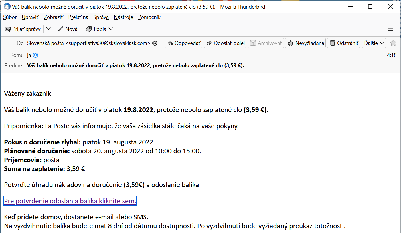 Na počiatku všetkého bol email. Ten dostanete do emailovej schránky a obsahuje bežnú informáciu o zadržanom balíku z dôvodu nezaplatenia colných poplatkov.