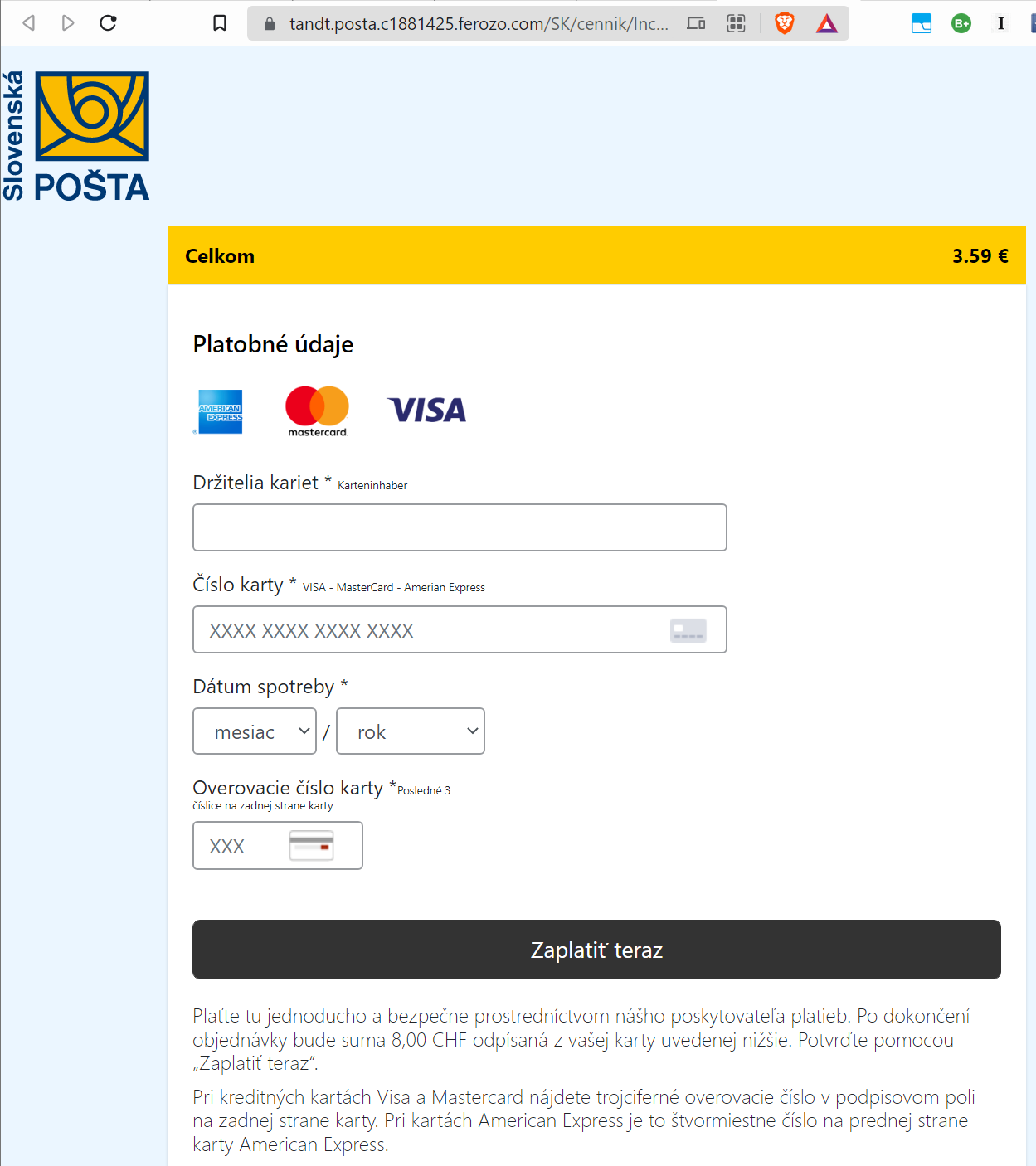 V tomto smere ide podvod ešte ďalej, no tu by mal byť varovný signál v riadku adresy. Tá so slovenskou poštou nemá nič spoločné a netreba byť veľký odborník na internet a doménové mená. Stránka od vás pýta údaje z karty, aby ste mohli previesť stanovenú sumu.