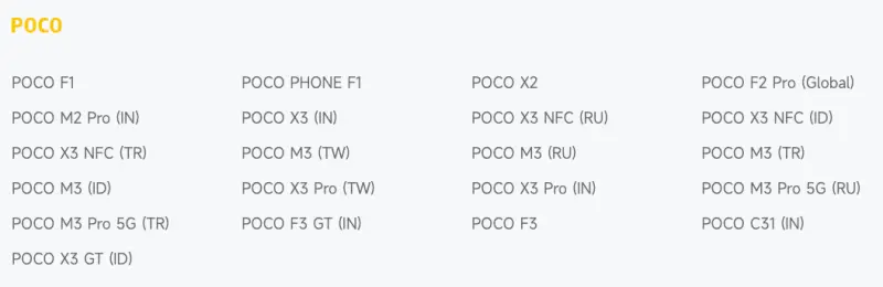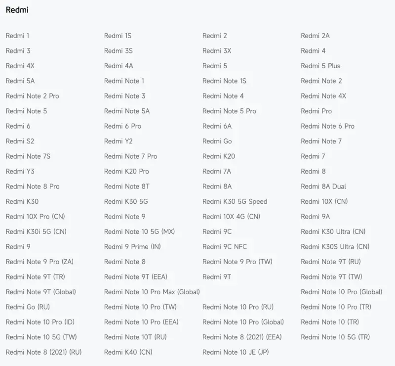 Namiesto toho sa ako novinky na zozname objavili modely Xiaomi CIVI v čínskej verzii, Redmi K40, Redmi Note 10 JE (Japan Edition), POCO C31 a POCO X3 GT v indickej verzii. Ani jeden z týchto modelov nie je na zozname uvedený pod ich globálnou verziou, preto sa pre náš trh zatiaľ nič nemení. Nižšie sa ale môžete pozrieť na vynovený zoznam smartfónov Xiaomi, Redmi aj POCO, ktoré už nie sú podporované.