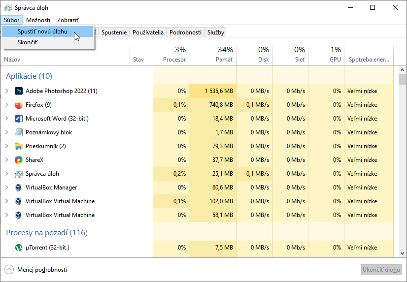 Otvorte si napríklad Správcu úloh (napríklad klávesovou skratkou CTRL+SHIFT+ESC) a pozrite sa na jeho horné menu, kde nájdete položku Súbor/Spustiť novú úlohu. Ak ju stlačíte, očakávateľne to vyvolá okno na spustenie ľubovoľného programu alebo procesu.