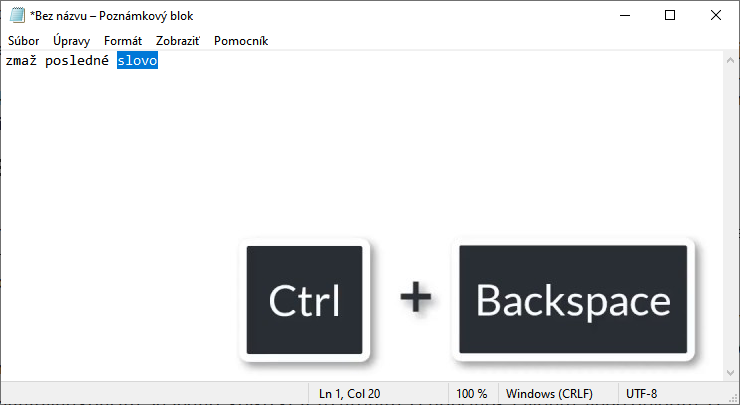 Jedným z takýchto banditov je správanie vymazávacej klávesy. Ak spolu s klávesom backspace stlačíte CTRL, tak namiesto písmena vľavo od kurzora sa zmaže celé slovo. Opakovaným stláčaním je tak možné text mazať dozadu slovo po slove.