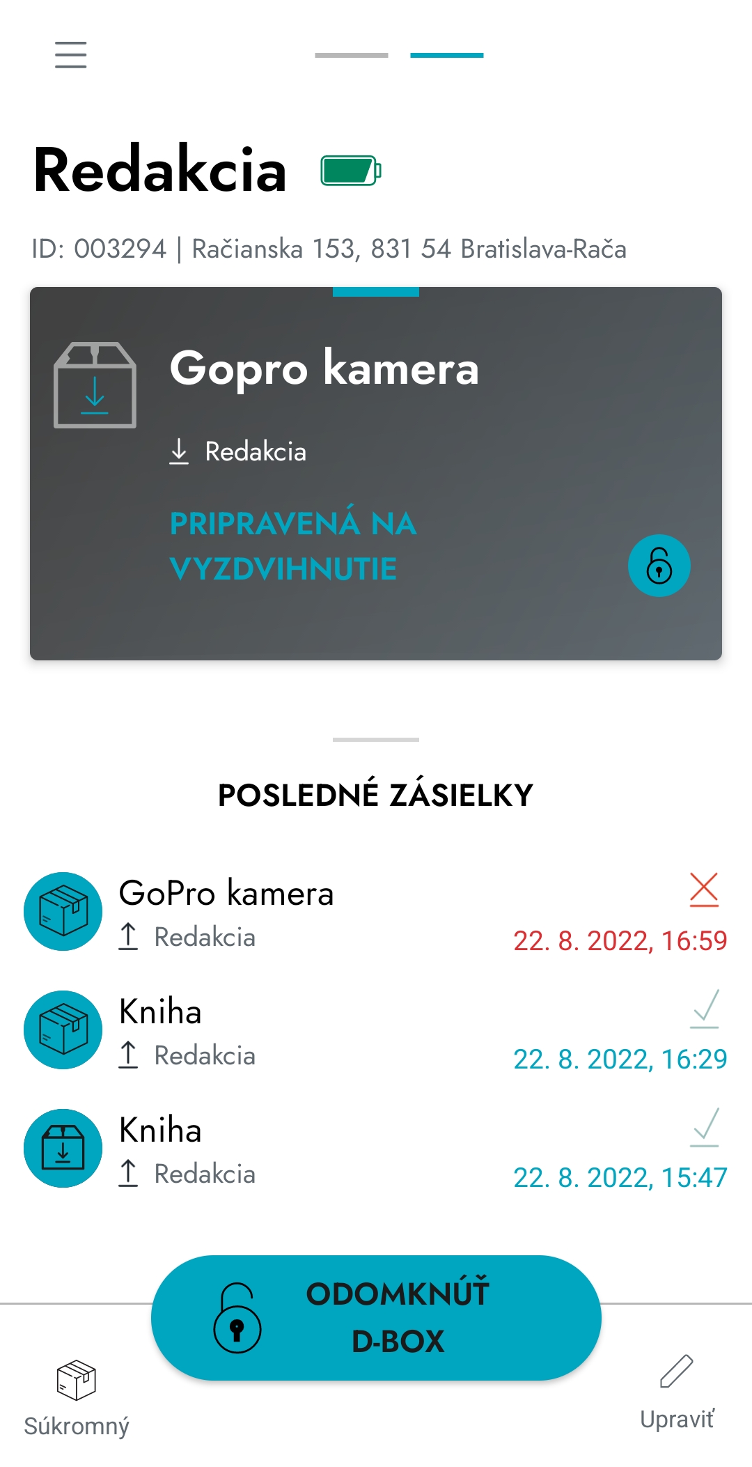 Následne kuriér vloží do D.Boxu balíček a skrinku rukou zatvorí. Otvoriť ju môžete opäť vy alebo aj vami poverená osoba, ktorej cez aplikáciu (vlastník boxu si musí stiahnuť aplikáciu a zaregistrovať sa do systému) prepošlete povolenie. O tom, že kuriér pre vás niečo do schránky vložil tiež dostanete informáciu a k dispozícii máte aj databázu takto doručovaných zásielok.