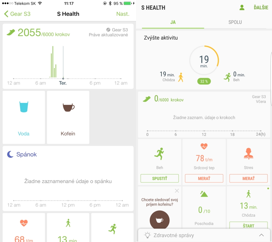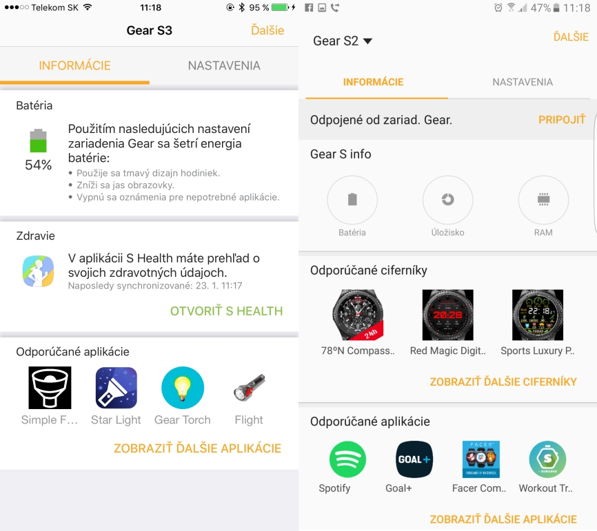 Na druhej strane, Gear S pre iOS ponúka rýchly prístup do obchodu s aplikáciami a dokonca aj k službe S Health. Toto je príjemné prekvapenie, najmä v porovnaní s hodinkami Android Wear, ktoré v kombinácii s iPhonom neumožňujú prístup k službe Google Fit cez telefón. S Health síce v iOS verzii neponúka plnohodnotnú aplikáciu, avšak cez zabudované webové rozhranie si pozriete všetky potrebné údaje a môžete dáta aj synchronizovať. My sme napr. používali hodinky Gear S3 v kombinácii so Samsung Galaxy S6 egde+ a následne sme ich začali používať s iPhonom. Vďaka synchronizácii údajov sme neprišli o žiadne dáta. Rovnako to fungovalo aj opačným smerom. Treba dodať, že S Health v aplikácii Gear S pre iOS neobsahuje toľko položiek ako v prípade samostatnej aplikácie pre Android, ale jej spracovanie je v rámci možností viac ako nadštandardné. Aplikácia Gear S ponúka aj webové rozhranie s prístupom do obchodu s aplikáciami. V tomto prípade sú už rozdiely výraznejšie a hoci si môžete do hodiniek nainštalovať ďalšie ciferníky alebo aplikácie, ich ponuka je menšia v porovnaní s obchodom s aplikáciami v telefónoch Samsung Galaxy.