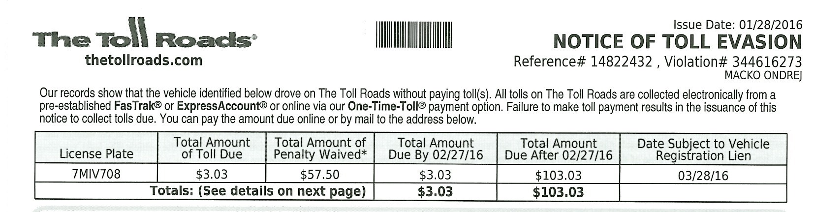 No aj aj dopadlo. Na adresu, ktorú je možné nájsť len pri hľadaní v slovenskom obchodnom registri mi prišiel asi po mesiaci list. A v ňom, že som nezaplatil poplatok za diaľnicu a teda je to pokuta 100 dolárov. Normálne to mal byť poplatok 3,30 dolára, teraz 103,30 dolára. A že keď nezaplatím, tak začnú proti mne súdne konanie. List som na chvíľu odložil a povedal som si, že ráno bude múdrejšie večera. A aj bolo. Ráno som našiel v liste maličkú poznámku, že v prípade mojej osoby majú záznam, že som nezaplatil poplatok za ich diaľnicu po prvýkrát. A keď to urobím do istého času, tak to bude tých 3,30 dolára, bez pokuty. Bol posledný deň, keď som mohol využiť túto, podľa mňa férovú možnosť na zaplatenie, a tak som aj rýchlo a rád urobil. Zaplatiť sa dalo cez internet, kartou, už som sa aj zaregistroval a som teda pripravený na moju budúcu návštevu platenej diaľnice v USA.