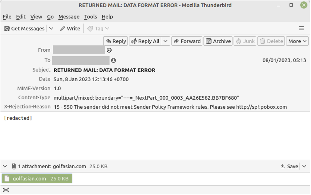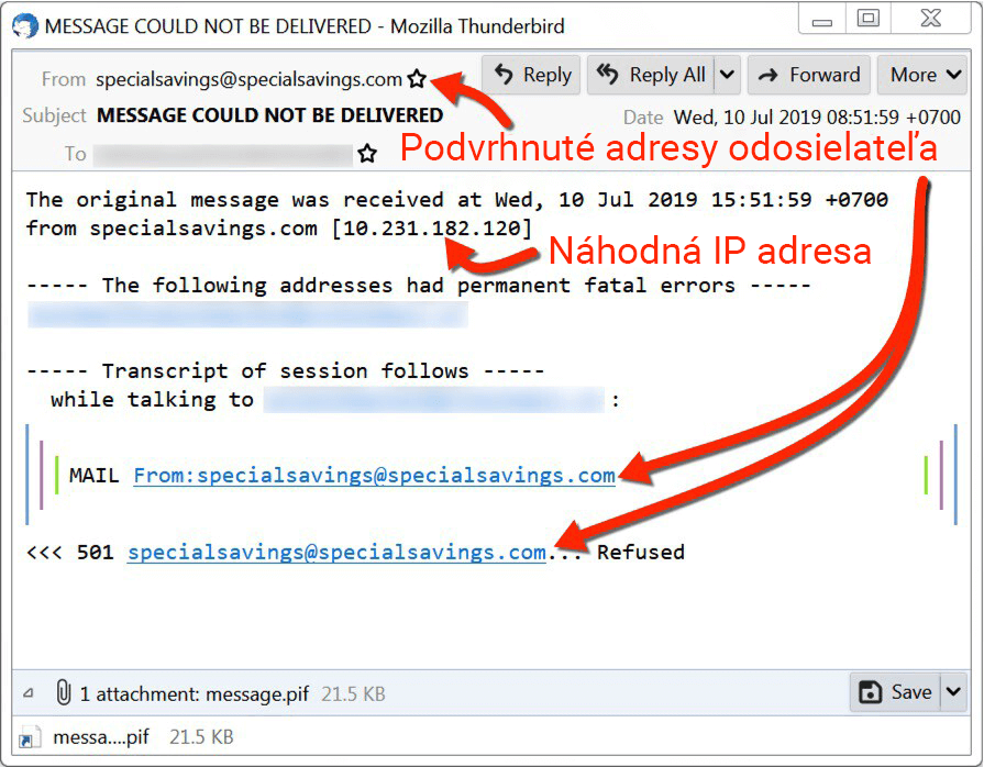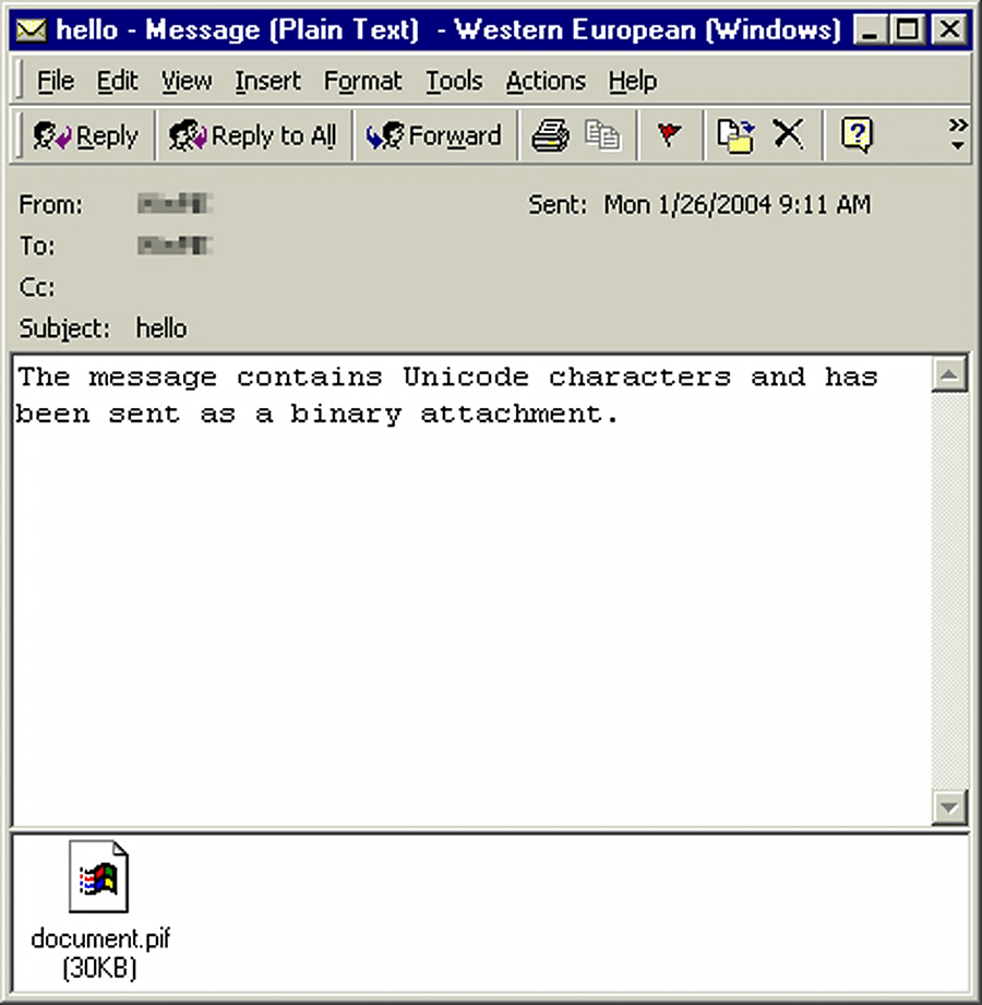 Samotný e-mail mal obvykle predmet v podobe „Mail Delivery System“, alebo „Mail Transaction Failed“, pričom najčastejšie obsahoval text typu „Táto správa nemohla byť zobrazená v 7-bitovom ASCII kódovaní a bola odoslaná v binárnej forme v prílohe.“ alebo napríklad aj „Prijatie e-mailu zlyhalo. Čiastočná správa je k dispozícii“.