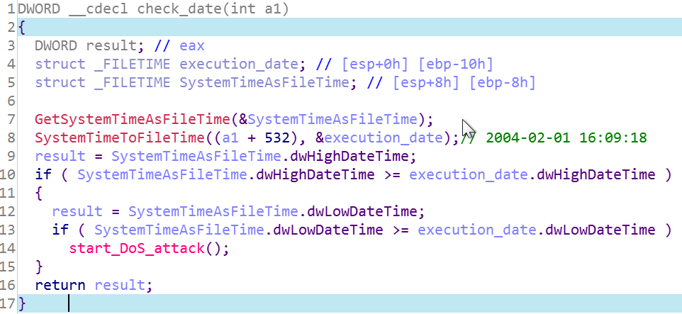 V kóde bol pritom vopred nastavený jasný cieľ. Už onedlho, presne 1. februára 2004, majú všetky infikované počítače zaútočiť na doménu www.sco.com, patriacu rovnomennej americkej softvérovej firme a zahltením jej dlhodobo zabrániť v činnosti.