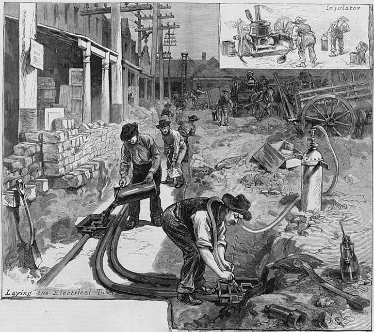 Dobová ilustrácia z roku 1882 znázorňujúca zakopávanie rozvodnej elektrickej siete pod ulice New Yorku /Library of Congress/