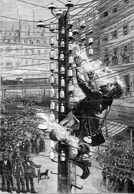 Dobová ilustrácia (1890) smrti John Feeksa, opravára telegrafných spojení, ktorý vykonával v New Yorku servis stožiaru. Netušil, že jeden z káblov sa o niekoľko ulíc ďalej prekrížil s vysokonapäťovým rozvodom striedavého prúdu a pred zrakmi okoloidúcich ho zabil silný elektrický výboj. Jeho telo dymilo a iskrilo na stožiari takmer hodinu, kým sa ho bezpečne podarilo dať dolu a za ten čas sa pod ním zhromaždilo niekoľko tisíc šokovaných divákov. /Physique Populaire by Emile Desbeaux 1891/
