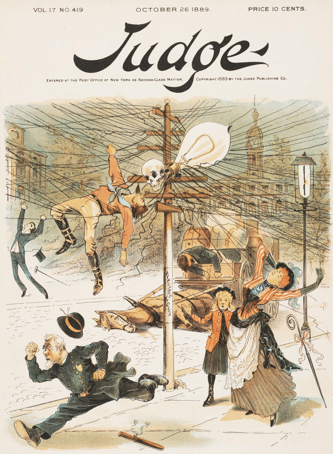 Dobová ilustrácia zo spravodaja z roku 1889, ukazujúca na nebezpečenstvo elektrifikácie