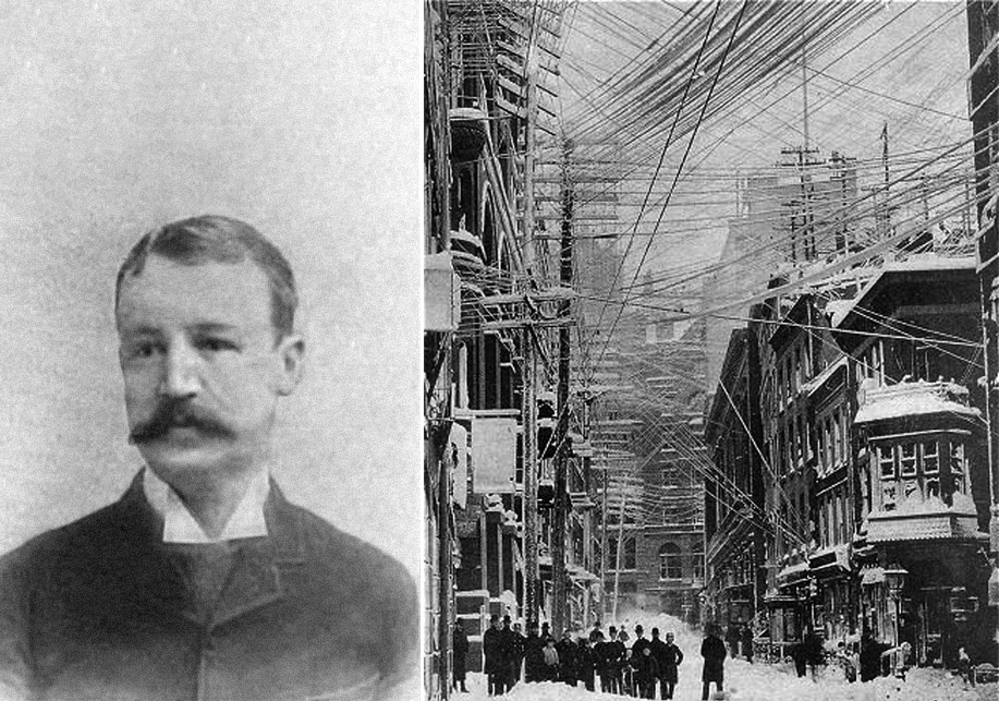 Harold Brown (vľavo) poukazoval aj na čerstvé prípady, kedy aktuálna snehová búrka v New Yorku strhla na zem jeden z obrovských zväzkov telegrafných a elektrických sietí, visiacimi nad hlavami obyvateľov mesta a kábel so striedavým prúdom zabil malého chlapca, ktorý sa ho dotkol.