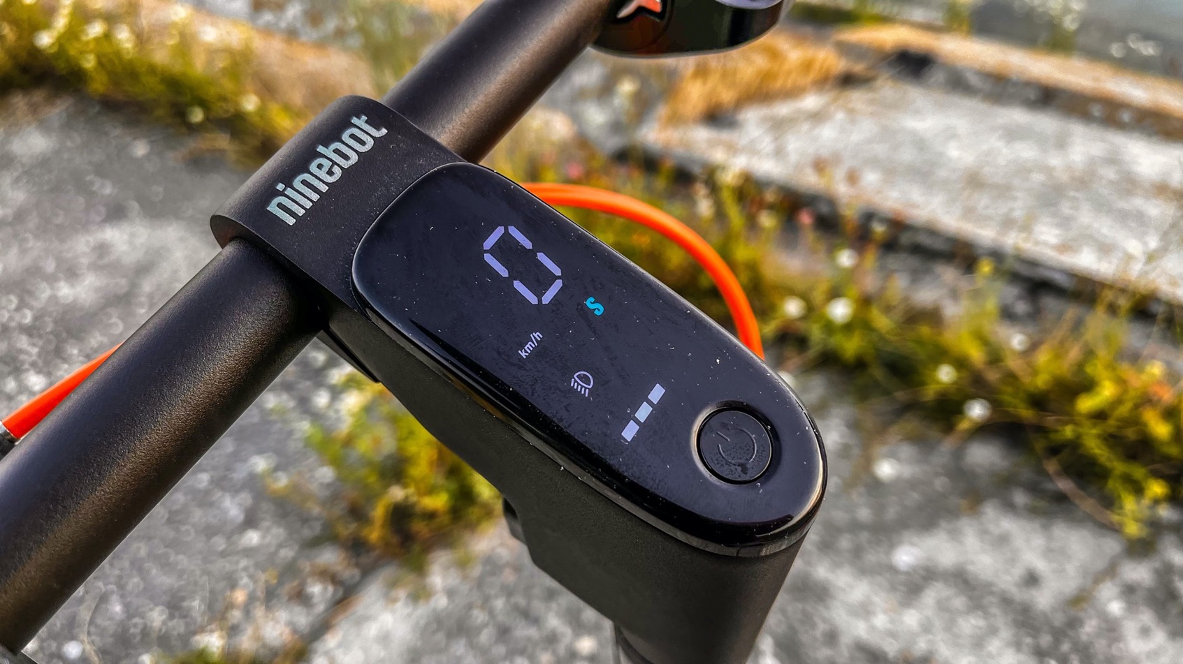 Základné funkcie kolobežky sa nastavujú na ovládacom panely s jedným tlačidlom – v strede riadidiel. Cením výbornú čitateľnosť LCD displeja na priamom slnku. Dvojklikom meníte režim kolobežky, jedným klikom zapínate výkonné LED svetlá (počas brzdenia zadné červené svetlo bliká vždy – aj keď sú svetlá vypnuté, čo je fajn bezpečnostný prvok). Samozrejmosťou je ukazovateľ aktuálnej rýchlosti a šesť políčok znázorňujúcich stav batérie.