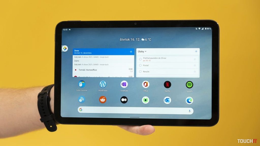 Nokia T20 má 10,36-palcový IPS displej s tenkými rámikmi a pomerom strán 5:3. Tento formát mi je viac sympatický v porovnaní s 11-palcovými modelmi, nakoľko je Nokia o niečo kompaktnejšia (o necelý 1 cm z hľadiska šírky aj výšky). Záleží však na vašich subjektívnych preferenciách.