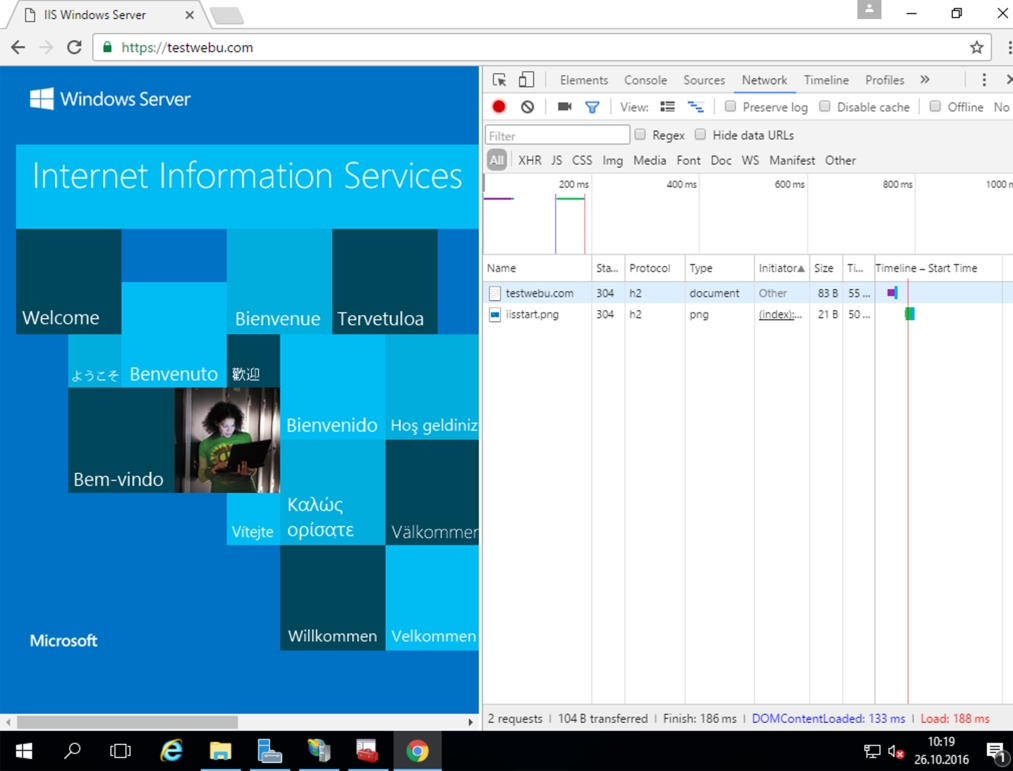 Hlavnou a veľmi očakávanou novinkou v IIS 10 je podpora HTTP/2 (HTTP 2.0). Ide o náhradu zastaraného protokolu HTTP, ktorá je rýchlejšia, modernejšia a menej zaťažuje server. Protokol HTTP/2 bude v prehliadačoch používaný len v šifrovanej podobe, bude tak synonymom pre šifrovanie internetu. Už spomínaná rýchlosť nového protokolu nie je len marketingovou frázou. Predchádzajúci protokol HTTP prenášal všetky dáta v textovej podobe a musel nadväzovať veľa spojení na zdrojový server, čím ho nemálo zaťažoval. Novší protokol je binárny a dáta stránok „tečú“ v jednom prúde. Viditeľný rozdiel určite uvidíte sami. V našom prípade sa obsah načítava cez HTTP/2 za polovičný čas.