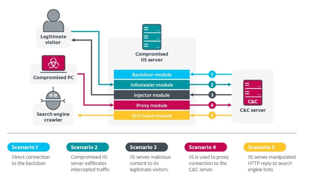 ESET objavil skupinu 10 doposiaľ nezdokumentovaných rodín malvéru, ktoré sú implementované ako škodlivé rozšírenia pre softvér webového servera Internet Information Services (IIS). Táto rôznorodá skupina škodlivého kódu odpočúva a manipuluje s komunikáciou servera.