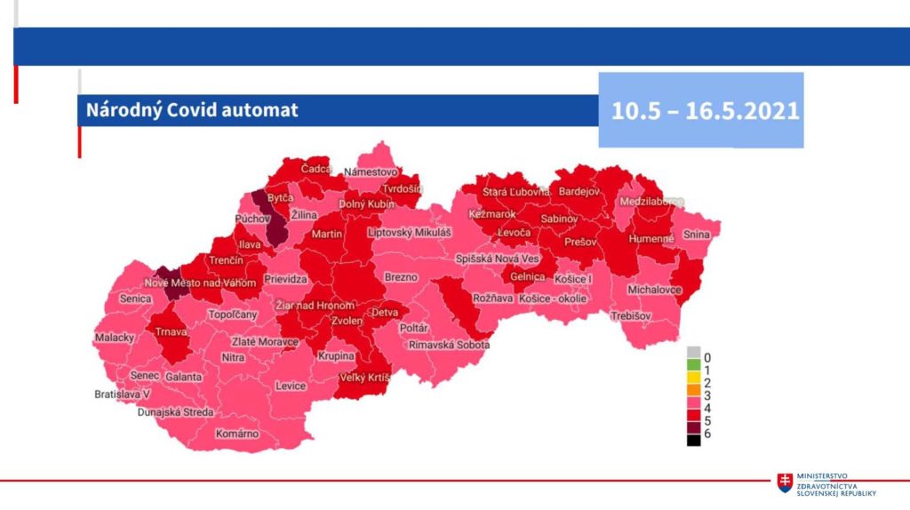 Na Slovensku sú od pondelka dva okresy v bordovej farbe, konkrétne je to Považská Bystrica a Myjava. Ostatých 33 je červených a ďalších 43 okresov je ružových. Je to výrazné zlepšenie voči predchádzajúcemu týždňu.