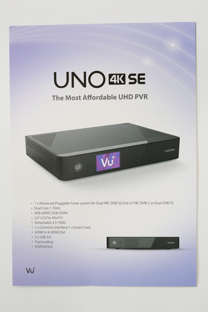 Hlavné predstavenie patrilo modelu Vu+ UNO 4K SE a Vu+ ZERO 4K. Sú to satelitné prijímače s rozlíšením 4K. Najnovší prijímač VU+ UNO 4K SE obsahuje displej, má zásuvný disk a nový tuner DVB-S2X typu FBC.