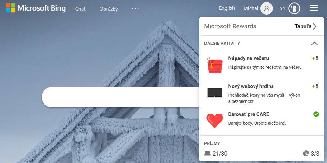 Za každé vyhľadanie získate 3 body. V prehliadači potrebujete byť prihlásený, respektíve je potrebné mať prihlásenie do vášho účtu v Bingu. Toto je identické s vyhľadávačom Google, kedy ste prihlásený povedzme do vyhľadávača Google, ale prakticky ide o prihlásenie do všetkých jeho služieb. Prihlásenie do prehliadača Microsoft Edge a spustenie jeho synchronizácie napríklad po čerstvej inštalácii Windows je zároveň prihlásením do služieb Bingu.