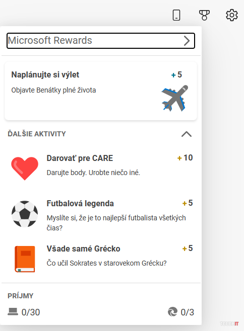 Informáciu o bodoch nájdete v nastaveniach systému a tiež na hlavnej stránke vyhľadávača Bing. Kliknutím na ikonu odznaku sa zobrazí menu, v ktorom budete môcť vidieť ďalšie aktivity na získanie bodov. Môžete si naplánovať výlet do Benátok, vyhľadať niečo o futbalovej legende alebo získať nápady na večeru. V skutočnosti nemusíte letieť do Benátok, ani variť jedlo, ktoré vám vyhľadávač poskytne. Stačí len na tieto tipy kliknúť a získate ďalšie body. Tieto body sú hodnotené lepšie a jedno kliknutie vám prinesie až 5 bodov.