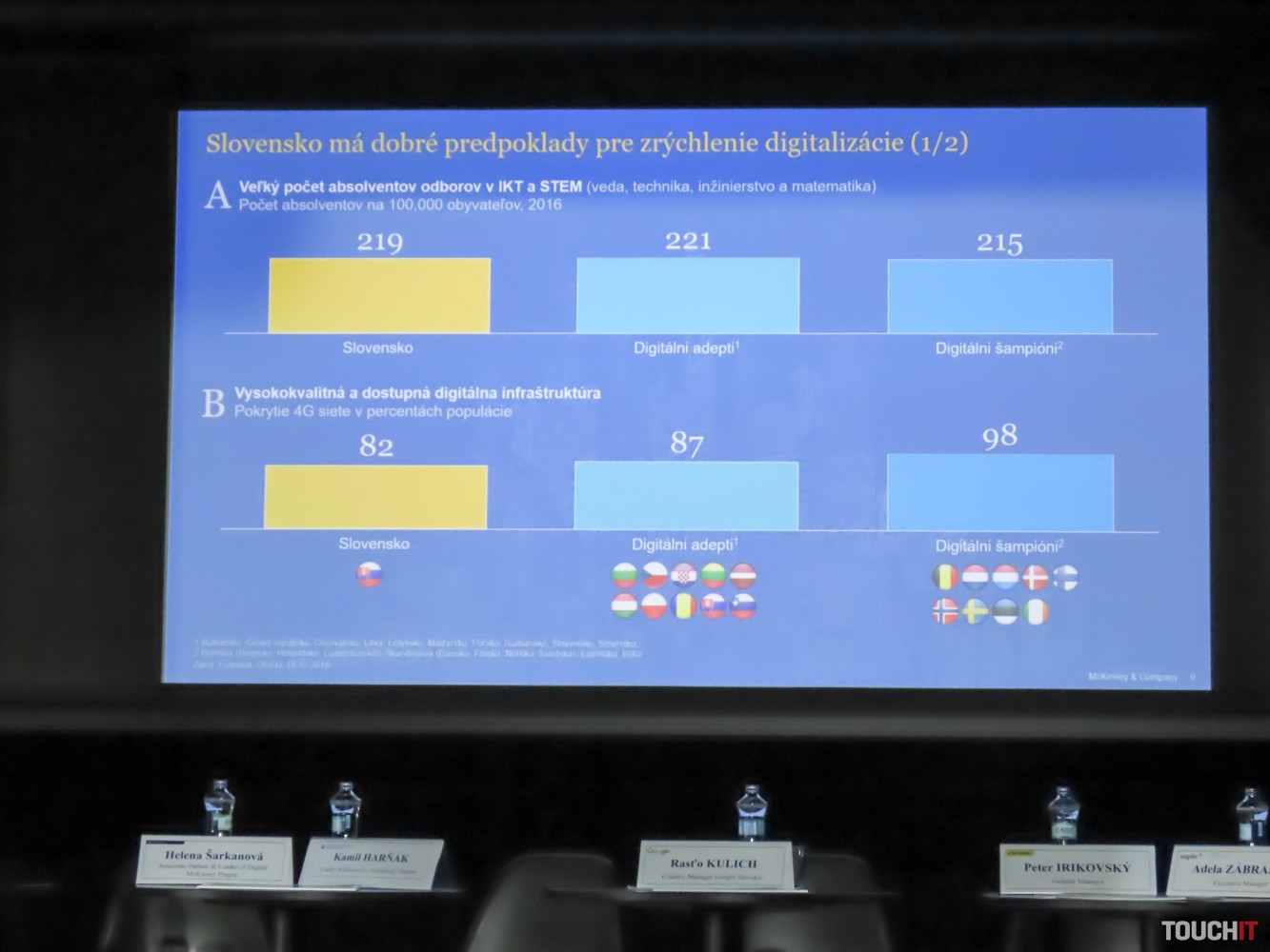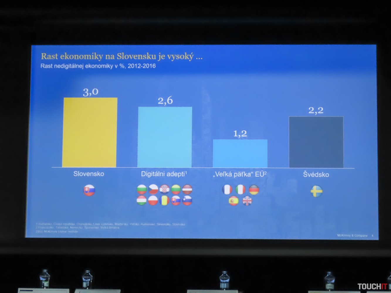 Slovensko má podľa McKinsey potenciál dohnať „digitálnych šampiónov“, medzi ktorých sa radia štáty Beneluxu (Belgicko, Holandsko, Luxembursko), Škandinávie (Dánsko, Fínsko, Nórsko, Švédsko), Estónsko a Írsko. „Hlavnými výhodami Slovenska sú otvorenosť trhu, veľký podiel vysokoškolsky vzdelaných ľudí, ako aj široká dostupnosť digitálnej infraštruktúry,“ zdôrazňuje štúdia.