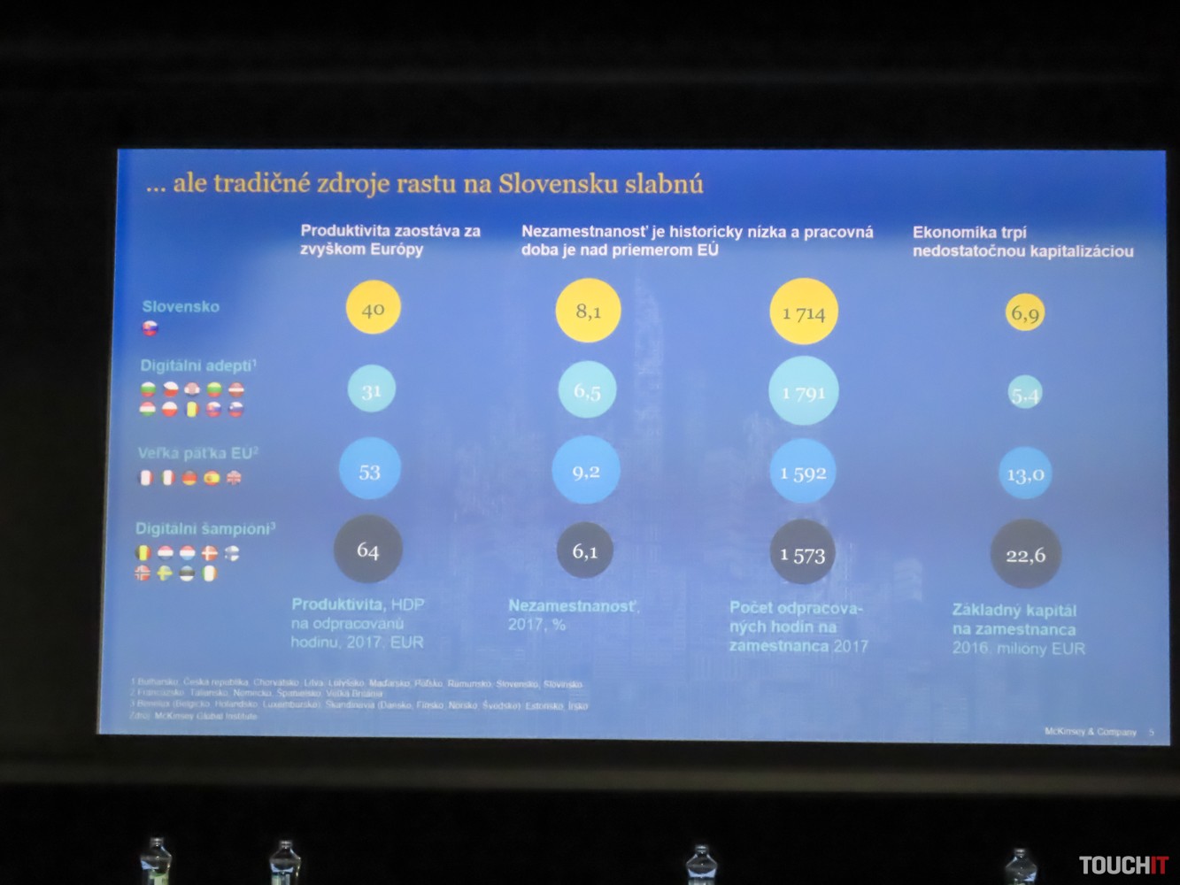 Produktivita Slovenska zaostáva za zvyškom Európy; naše HDP na odpracovanú hodinu je o štvrtinu nižšie ako je priemer „veľkej päťky EÚ“ (Nemecko, Veľká Británia, Francúzsko, Talianko a Španielsko). Výhoda lacnej pracovnej sily sa postupne znižuje. Slovenská ekonomika je podkapitalizovaná: základný kapitál na zamestnanca je zhruba o polovicu nižší ako vo „veľkej päťke EÚ“. Zároveň sa prejavujú negatívne demografické trendy, znižovanie pôrodnosti, emigrácia či starnutie. „Slovensko potrebuje nový motor ekonomického rastu. Mohla by ním byť práve digitalizácia,“ tvrdia autori štúdie.Máme dobré základy vo vzdelaní a infraštruktúre, rastieme však sedemkrát pomalšie ako „digitálni šampióni“ Európy