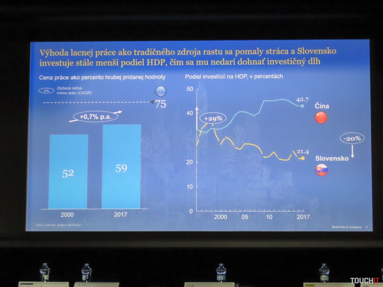 Tradičné zdroje rastu sa pomaly vyčerpávajú. „Za posledných 30 rokov Slovensko zaznamenalo rýchly rozvoj. HDP na obyvateľa vzrástlo medzi rokmi 1996 a 2017 o 114 percent. Zaslúžili sa o to predovšetkým dynamický vývoz, investície zo zahraničia, výhodná cena práce a v neposlednom rade dotácie z fondov Európskej únie. Lenže tieto zdroje rastu postupne narážajú na svoje limity,“ vysvetľuje Helena Šarkanová, Associate Partnerka zodpovedná za McKinsey Digital na Slovensku.