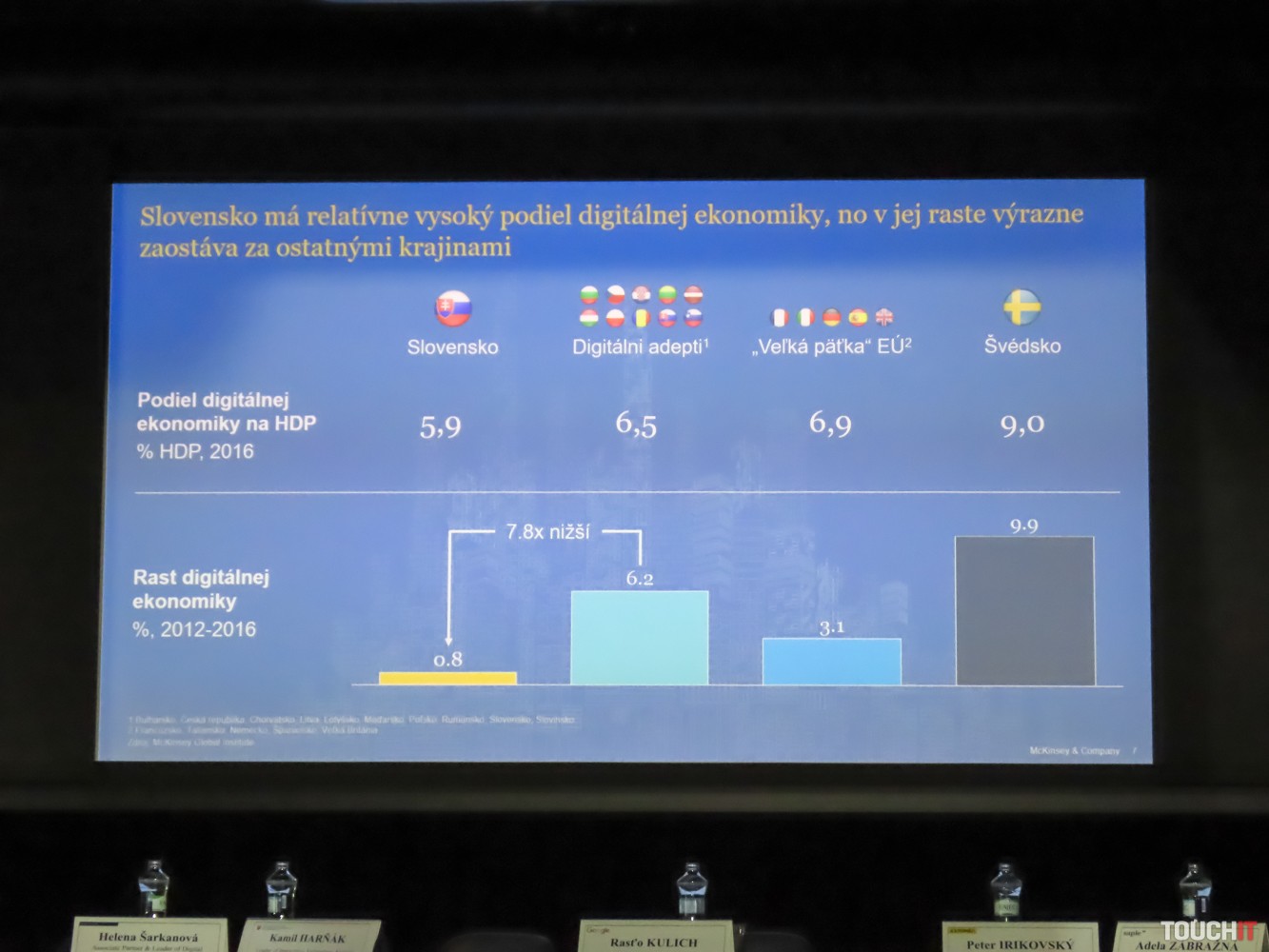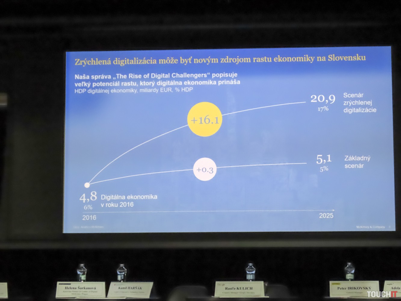 Ak by sa Slovensko úrovňou digitalizácie priblížilo krajinám západnej a severnej Európy, do roku 2025 by mu to prinieslo ročne dodatočných 16 miliárd eur v HDP. To je napríklad skoro päťnásobok výdajov štátu na vzdelávanie a školstvo za rok 2018. Slovensko by sa stalo jednou z najvýkonnejších ekonomík v Európe a využilo by tak potenciál, ktorý na rast digitálnej ekonomiky má. Vyplýva to zo štúdie globálnej konzultačnej spoločnosti McKinsey „The rise of Digital Challengers – Perspective on Slovakia“.