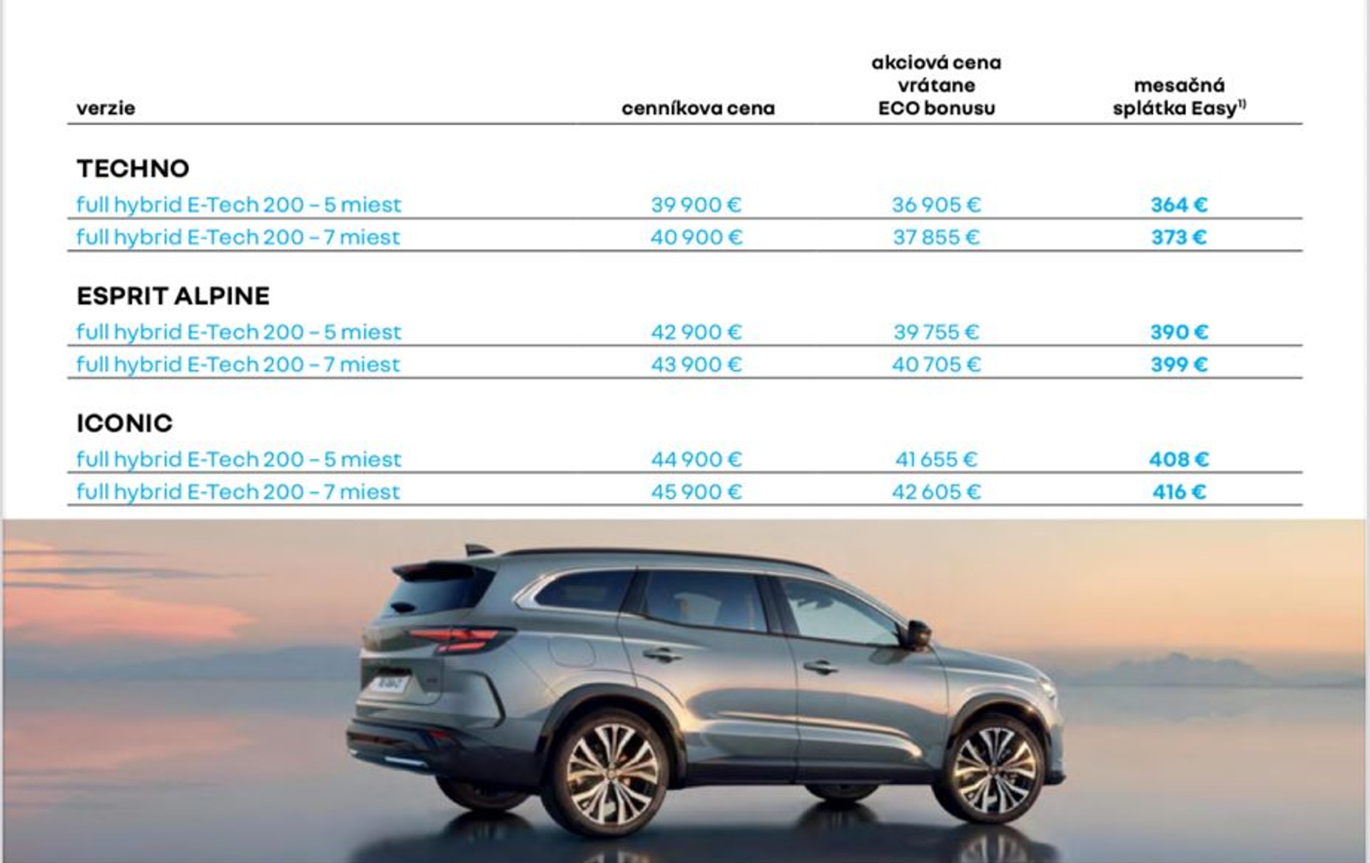 Nový Renault Espace prináša modernizovaný dizajn, nové technologické prvky, vylepšenú zvukovú izoláciu a prepracovanú pohonnú jednotku Full Hybrid E-Tech pre plynulejšie zrýchlenie. Renault Espace je tak vozidlo na dlhé cesty s priestrannosťou a modularitou, pričom zdokonaľuje svoju technologickú úroveň a úroveň komfortu. Kapacita batožinového priestoru je až 943 litrov v 5-miestnej verzii.