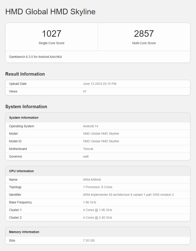 HMD Skyline využíva základnú dosku s označením Tomcat, čiže existujú ešte malé nezrovnalosti v tom, či označenie Skyline je skutočne konečný názov tohto smartfónu. Výpis z Geekbench ďalej odhaľuje aj ďalšie detaily výbavy, ako 8 GB RAM alebo Android 14.