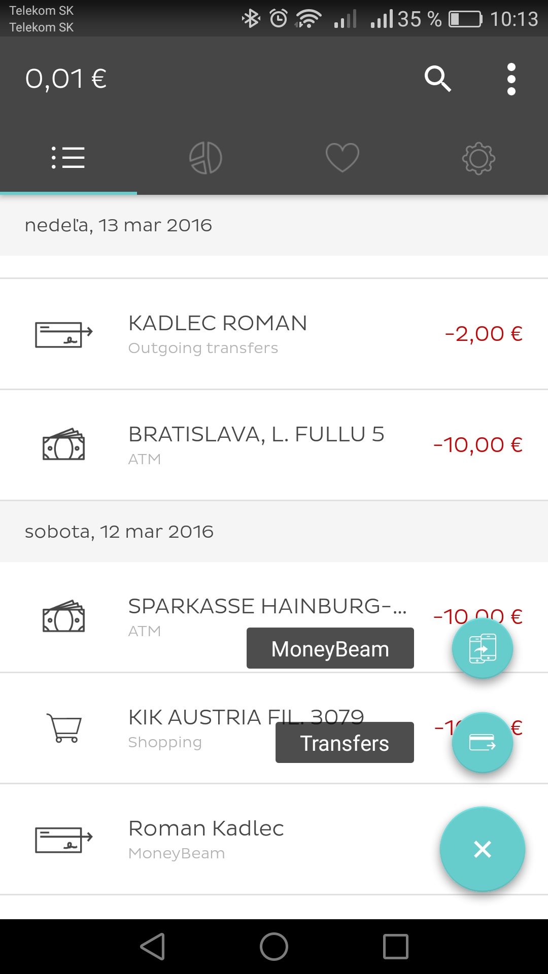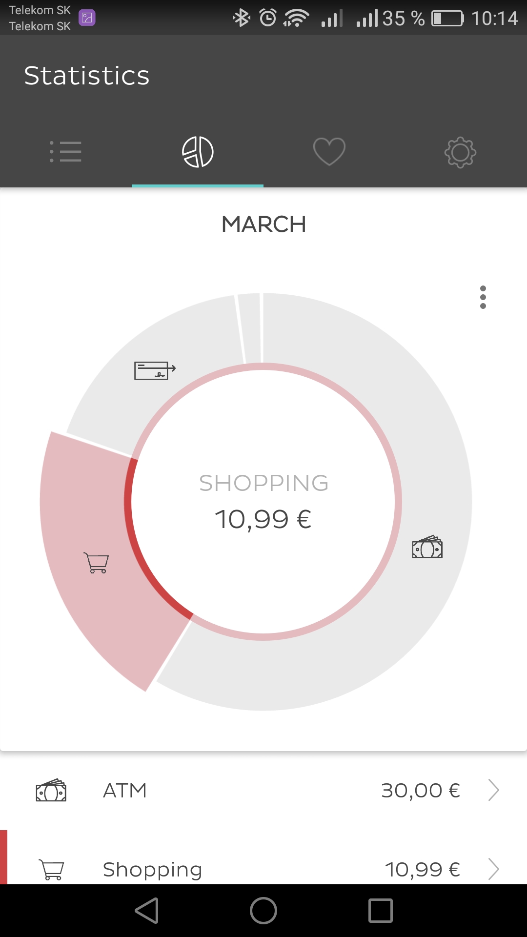 Čo sa funkcionality hlavných dvoch sekcií týka, v tomto smere sa ponúka porovnanie s bankou mBank. Každá transakcia je totiž automaticky zaradená do jednej z kategórií – výber z bankomatu, nakupovanie, platba v reštaurácii, poistenie, výdavky na auto, domácnosť atď. V sekcii štatistika sú všetky informácie zrozumiteľne prezentované vo forme koláčového grafu. Priradenie kategórií k transakciám je možné podľa potreby zmeniť. Takisto si môžete k transakciám pridať fotografie a poznámky.